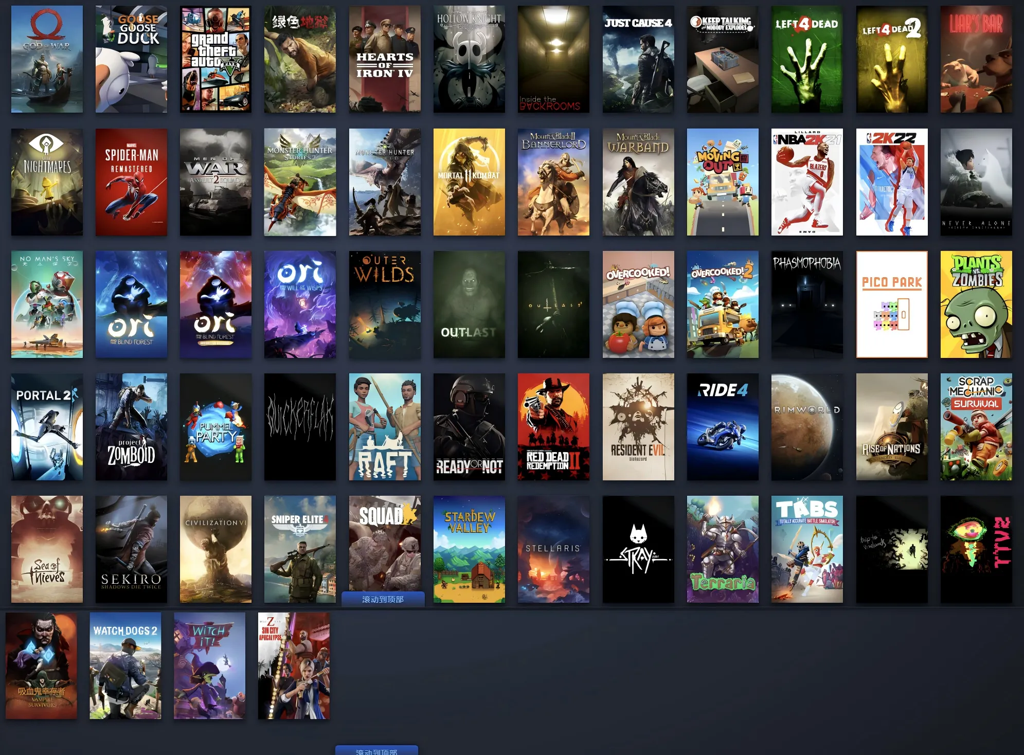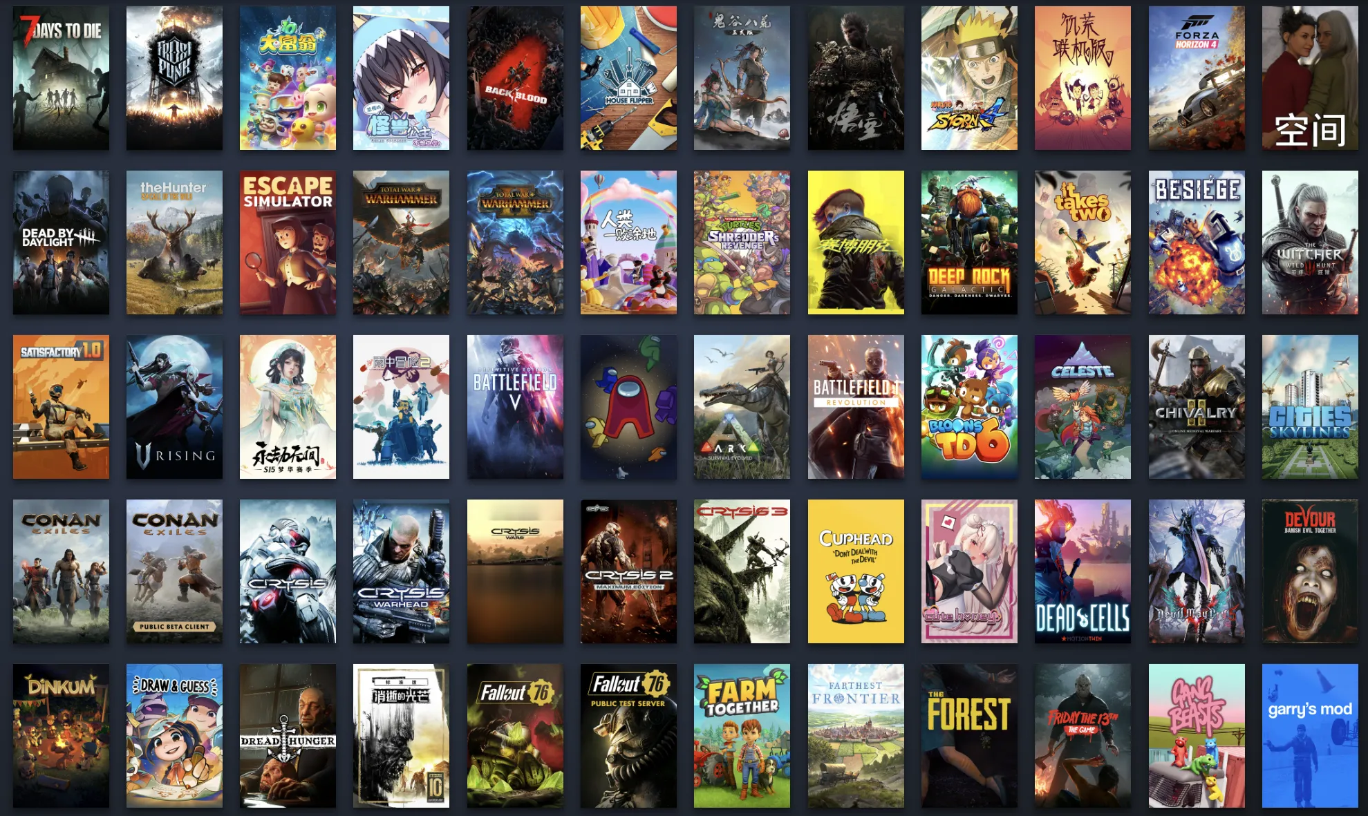 REPO、骗子酒吧、黑神话悟空、索尼漫威蜘蛛侠重置版/漫威蜘蛛侠复刻版(Marvel’s Spider-Man Remastered)、流浪猫/迷失预购版(Stray)、战地2042/战地风云2042、赛博朋克2077 (Cyberpunk 2077)、最远的边陲(Farthest Frontier)、皇家厨房 (crsed)、逃出生天 (A Way Out)、模拟人生4 (The Sims™ 4)、泰坦陨落1 (Titanfall™)、泰坦陨落2 (Titanfall® 2)、鬼谷八荒 (Lightning Games Official) 系列、双人成行 、NBA2K21、极限竞速:地平线4终极版、战地1、战地5/战地风云5、小小梦魇/小小噩梦 (Little Nightmares)、绝地求生、安抚(Pacify)、严阵以待(Ready Or Not)、恐鬼症/幽灵恐怖(Phasmophobia)、吞噬(DEVOUR)、幸福工厂(Satisfactory)、NBA 2K22/NBA2K22、恐惧饥饿/恐惧饥荒/海上狼人杀/大航海狼人杀(Dread Hunger)、围攻(Besiege)、盖瑞模组(Garry's Mod)、吸血鬼起义/吸血鬼崛起(V Rising)、全面战争战锤(Total War: WARHAMMER)、全面战争战锤2(Total War: WARHAMMER II)、人类一败涂地 ( Human Fall Flat)、永不孤单(Never Alone (Kisima Ingitchuna))、雨中冒险2(Risk of Rain 2)、僵尸毁灭工程(Project Zomboid)、巫师3狂猎(The Witcher 3: Wild Hunt)、揍击派对(pummel party)、海贼之海(Sea of Thieves)、战术小队(Squad)、骑士精神2(Chivalry 2)、茶杯头(Cuphead)、深岩银河系(Deep Rock Galactic)、房产达人(House Flipper)、星露谷物语(Stardew Valley)、迷失森林(The Forest)、木筏生存(Raft)、僵尸大战世界劫后余生豪华版(World War Z: Aftermath - Deluxe Edition)、饥荒联机版(Don't Starve Together)、狙击精英4豪华版(Sniper Elite 4 Deluxe Edition)、城市天际线豪华版(Cities: Skylines Deluxe Edition)、求生之路1,求生之路2( Left 4 Dead, Left 4 Dead 2)、《消逝的光芒》决定版(Dying Light)、泰拉瑞亚(Terraria)、钢铁雄心4军校生版(Hearts of Iron IV: Cadet Edition)、侠盗猎车手5豪华版/GTA5(Grand Theft Auto V:豪华版)。鬼泣5(Devil May Cry 5 + Vergil)、喋血复仇(Back 4 Blood)、黎明杀机(Dead by Daylight)、方舟生存进化(ARK: Survival Evolved)、骑马与砍杀1战团(Mount and Blade: Warband)、人渣(SCUM)、七日杀/7日杀(7 Days to Die)、废品机械师(Scrap Mechanic)、猎人荒野的呼唤(theHunter: Call of the Wild™)、13号星期五/十三号星期五(Friday the 13th: The Game)、逃生1(Outlast)、逃生2(Outlast 2)、气球塔防10(Bloons TD 6)、大富翁10(Richman 10)、空洞骑士(Hollow Knight)、胡闹厨房1/分手厨房1(Overcooked)、胡闹厨房2/分手厨房2(Overcooked!2)、胡闹搬家(Moving Out)、基佬大乱斗/小小萌人大乱斗(Gang Beasts)、极速骑行4终极版(RIDE 4)、在我们之间/天空狼人杀(Among Us)、一起农场(Farm Together)、忍者龟施莱德的复仇(Teenage Mutant Ninja Turtles: Shredder's Revenge)、真人快打11(Mortal Kombat 11)、绿色地狱/丛林地狱(Green Hell)、文明6豪华版(Sid Meier's Civilization VI : Platinum Edition)、只狼影视二度(Sekiro: Shadows Die Twice)、流放者柯南/蛮王柯南(Conan Exiles - Standard Edition)、死亡细胞(Dead Cells)、火影忍者 疾风传 终极风暴4(NARUTO SHIPPUDEN: Ultimate Ninja STORM 4)、传送门2(Portal 2)、密室逃脱模拟器(Escape Simulator)、女巫来了(Witch It)、怠惰的怪兽公主不想工作、你画我猜、骑马与砍杀2霸主(Mount & Blade II: Bannerlord)、荒野大镖客2/荒野大表哥2(Red Dead Redemption 2)、战神4(God of War)、看门狗2(Watch_Dogs2)、正当防卫4完整版(Just Cause 4 Co mplete Edition)、夜族崛起/吸血鬼幸存者(Vampire Survivors)、怪物猎人世界(Monster Hunter: World)、怪物猎人2毁灭之翼(Monster Hunter Stories 2: Wings of Ruin)、全面战争模拟器(Totally Accurate Battle Simulator)、群星(Stellaris - Galaxy Edition)、无人深空(No Man's Sky)、蒸汽朋克(Frostpunk)、辐射76(Fallout 76)、国家的崛起拓展版(Rise of Nations: Extended Edition)、环世界(RimWorld)、保持交流就无人爆炸/继续说话就无人爆炸(Keep Talking and Nobody Explodes)、战争之人突击小队2(Men of War: Assault Squad 2)、生化危机7(RESIDENT EVIL 7)、精灵与萤火日志(Ori and the Will of the Wisps)、奥日与黑暗森林/奥日与森林决定版( Ori and the Blind Forest: Definitive Edition)、猫公园(PICO PARK)、农场模拟类(Dinkum)、蔚蓝(Celeste)、星际拓荒(Outer Wilds)、深入后室/后室攻略/后室(Inside The Backrooms)、霓虹深渊