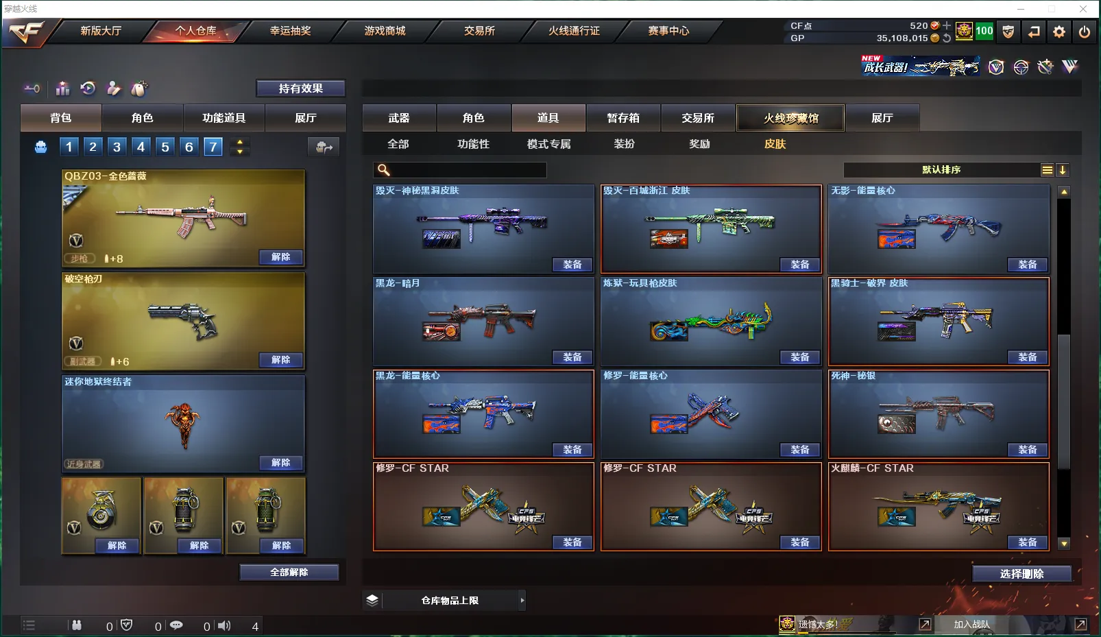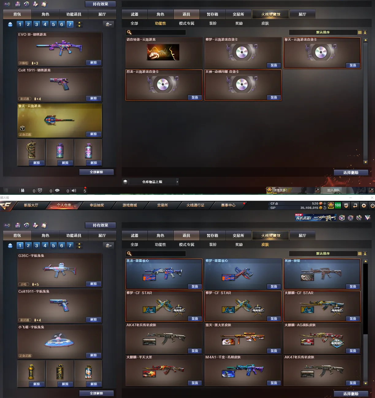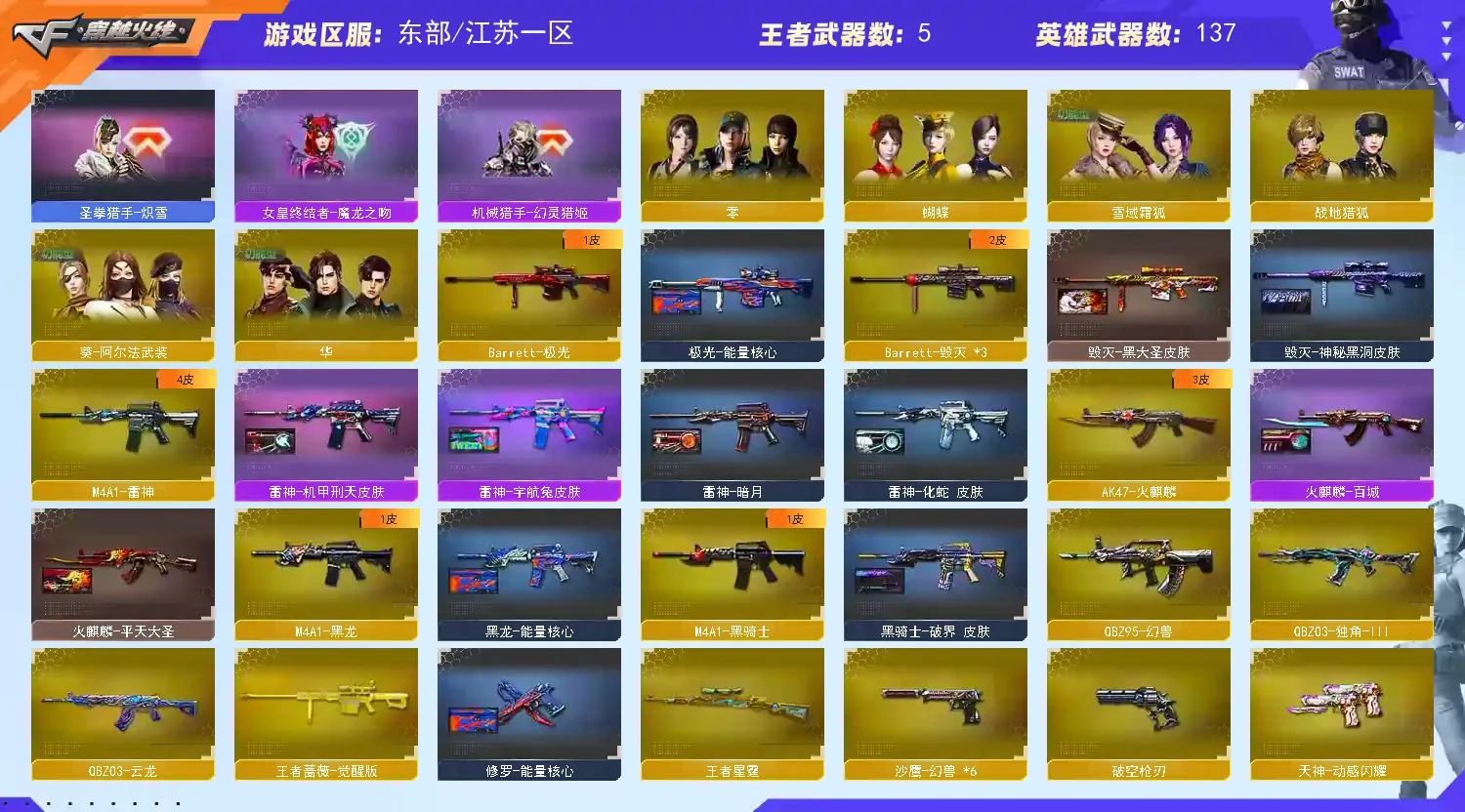 【皮肤】:超新星-深海萌鲨皮肤、金色蔷薇-热带奇洋皮肤、屠龙-星火燎原皮肤、雷神-机甲刑天皮肤、屠龙-小叮当皮肤、龙啸-蛇姬皮肤、炼狱-夏佐皮肤、炼狱-电子连击皮肤、死神-机甲核心皮肤、火麒麟-百城、雷神-宇航兔皮肤、毁灭-神秘黑洞皮肤、黑骑士-破界皮肤、毁灭-百城浙江皮肤、炼狱-玩具枪皮肤、死神-秘银、Barrett-金色蔷薇-蛇姬皮肤、火麒麟-雷神、黑龙-暗月、雷神-化蛇皮肤、AK47老兵传说皮肤、毁灭-黑大圣皮肤、火麒麟-AG战队皮肤、火麒麟-平天大圣、M4A1-千变-孔明皮肤、火麒麟-CFSTAR、修罗-CFSTAR
