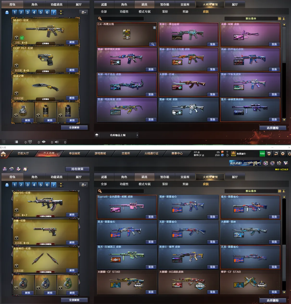 【皮肤】:黑骑士-摸金校尉、龙啸-蛇姬皮肤、雷神-机甲刑天皮肤、雷神-源计划2.0专属皮肤、死神-机甲核心皮肤、炼狱-电子连击皮肤、火麒麟-百城皮肤、雷神-宇航兔皮肤、黑鲨-电流骇客皮肤、雷神-化蛇皮肤、毁灭-神秘黑洞皮肤、黑龙-暗月、火麒麟-心动糖果、Barrett-金色蔷薇蛇姬皮肤、火麒麟-雷神、毁灭-百城浙江皮肤、黑骑士-破界皮肤、火麒麟-AG战队皮肤、火麒麟-CFSTAR、修罗-CFSTAR、(天龙-能量核心、无影-能量核心、黑龙-能量核心、极光-能量核心、雷神-能量核心、修罗-能量核心)