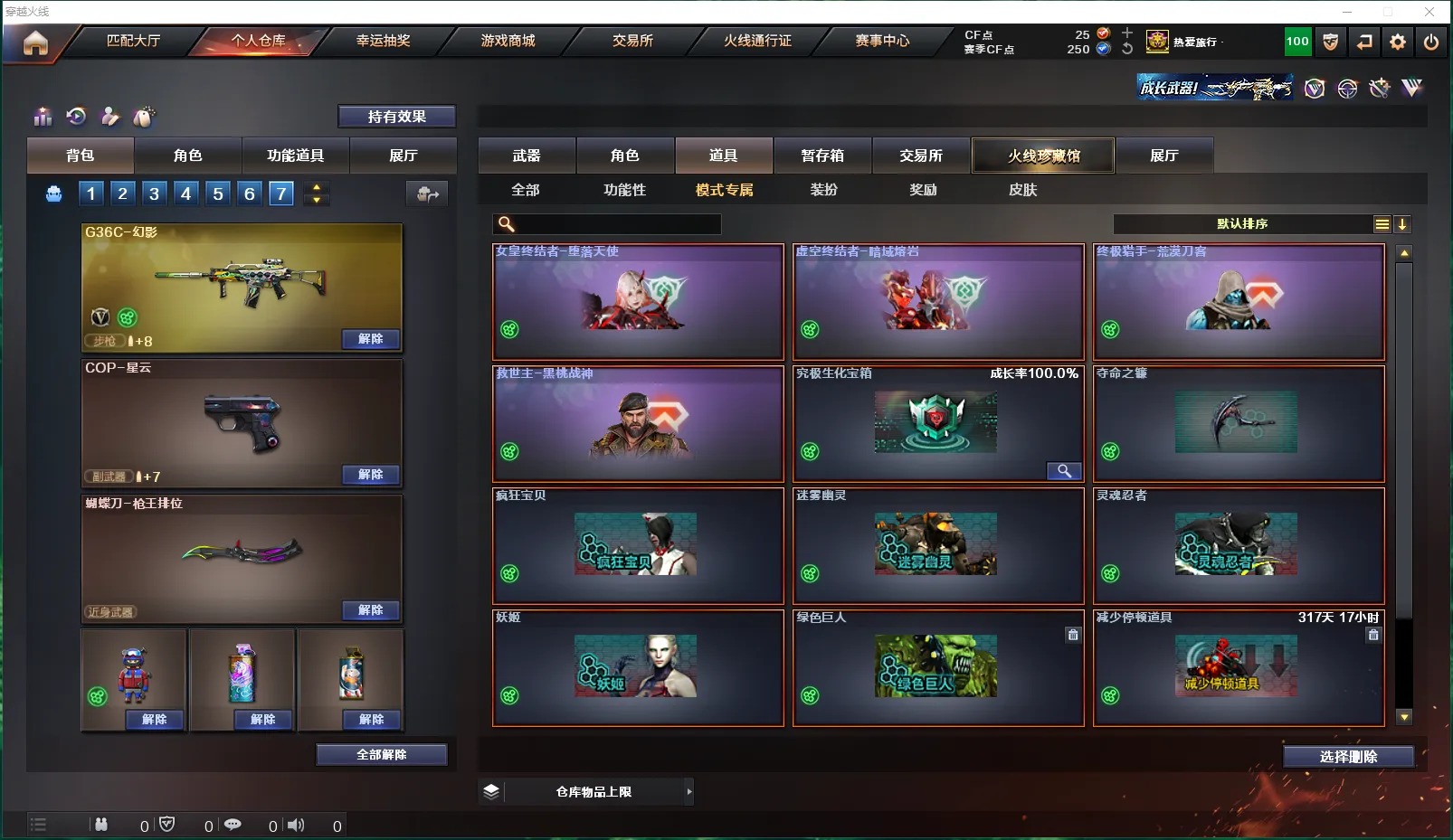 绿色巨人、疯狂宝贝、迷雾幽灵、灵魂忍者、妖姬、变异宝贝、夺命之镰、生化弹匣、防化服、减少停顿道具(不退包)