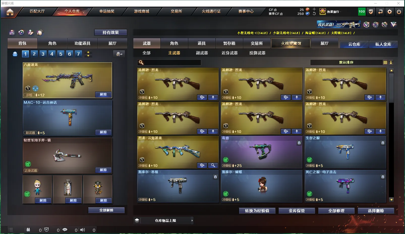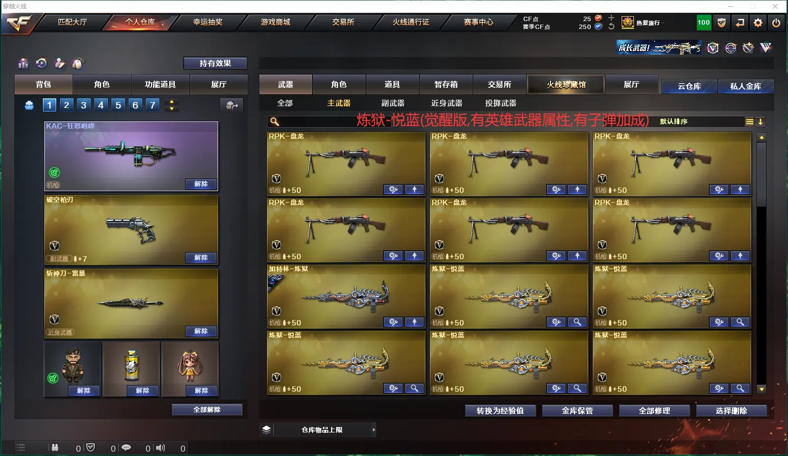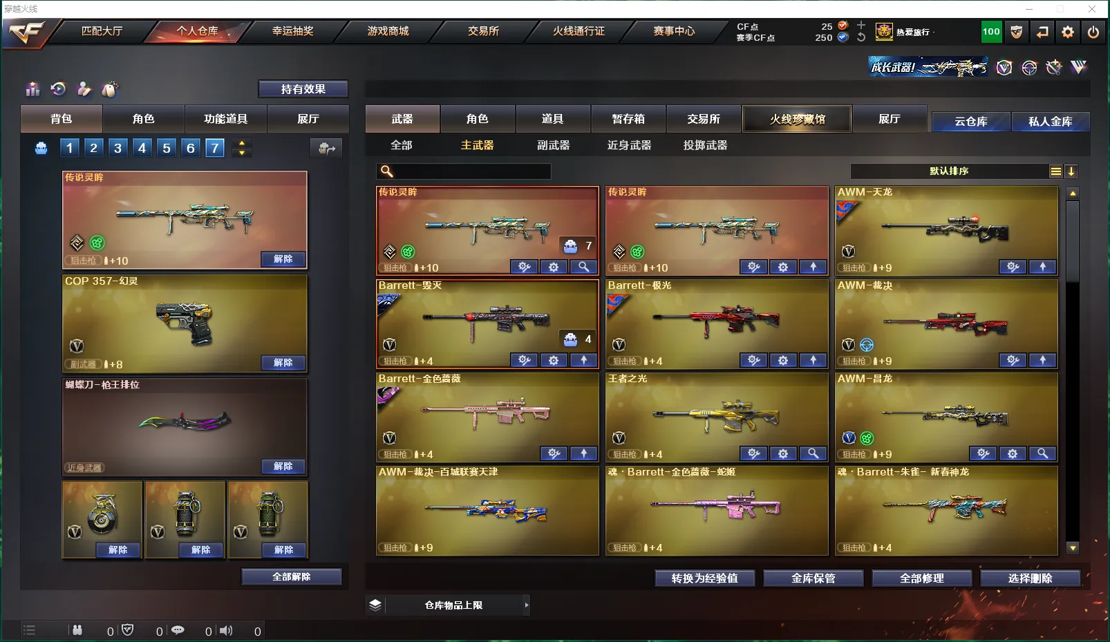 【挑战】:《主武器》:AK47-冰龙粉碎者、AK47-泰坦破坏者Ⅲ、冰龙粉碎者-白马银枪、激光毁灭者Ⅲ-白马银枪、乱世-超越2、神圣爆裂者-末日Ⅲ、征服者-超越2、神罚、M240B-苍雷、末日裁决者、《副武》:巡航者、《近武》:等离切割者、末日之拳、破天斩魔剑、双龙、双龙-秘银、斩神刀、夺魂、迷你波特博士、魔能环、魔能镰刀、萨拉坦铁棍、死神之珠、唐刀-大唐荣耀、唐刀-盛世太平、《投掷》:反应堆手榴弹、魔花手雷、深渊终结者手雷、手雷-波特魔方、无尽空虚手雷、