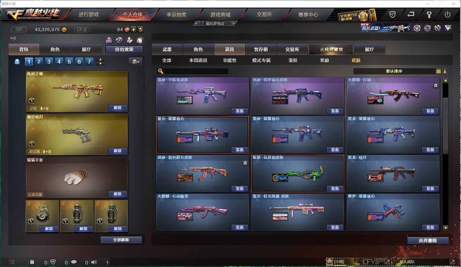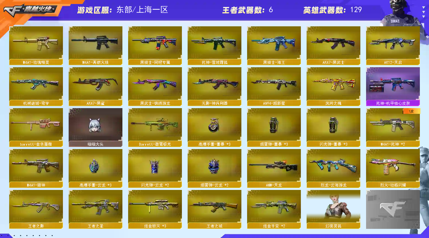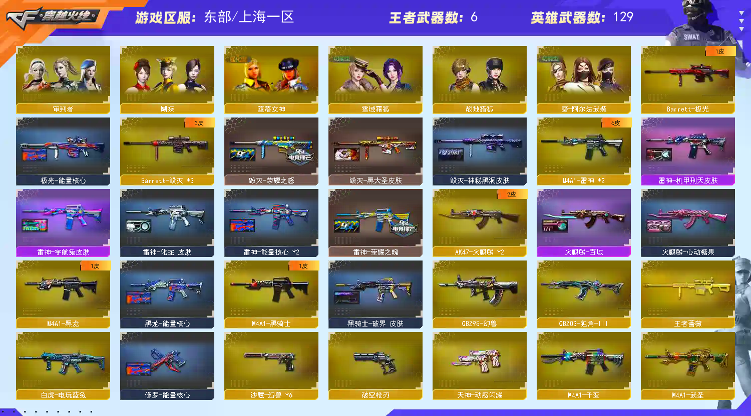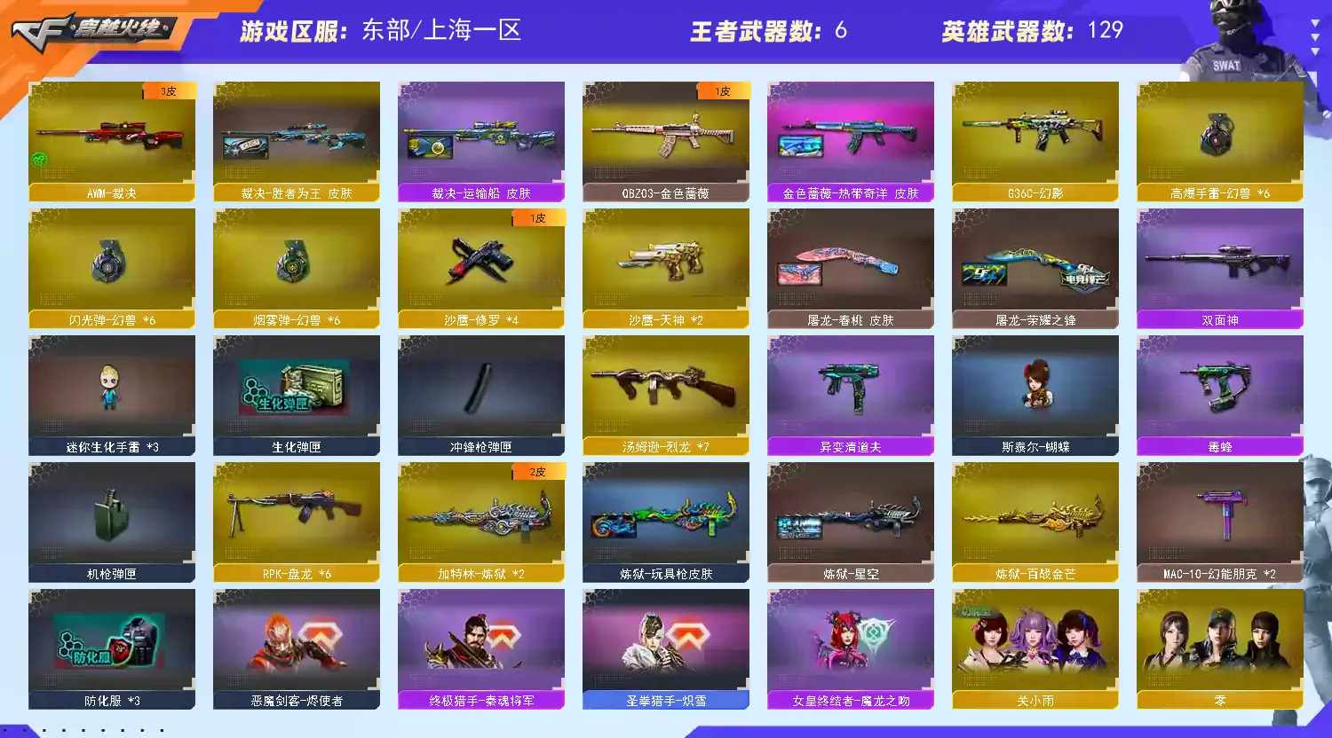 【英雄武器】:审判者、零、蝴蝶、关小雨、M4A1-千变、AK47-火麒麟*2、M4A1-黑龙、M4A1-雷神、M4A1-黑骑士、M4A1-死神*2、AK47-黑武士、AK12-天启、AN94-超新星、M4A1-武圣、AK47-黑鲨、无影-神兵利器、烈火-动感闪耀、G36C-幻影、黑武士-锦绣游龙、超新星-热带奇洋、M4A1-凌龙-Ⅰ、M4A1-玫瑰精灵、QBZ95-幻兽、QBZ03-金色蔷薇、M4A1-猎神、黑骑士-海王、白虎-电玩蓝兔、AWM-天龙、Barrett-毁灭、Barrett-极光、AWM-裁决、Barrett-金色蔷薇、RPK-盘龙*6、加特林-炼狱*2、汤姆逊-烈龙*7、烈龙-云海游龙、沙鹰-修罗*3、沙鹰-天神*2、Glock18-武圣、天神-动感闪耀、破空枪刃、沙鹰-幻兽*6、屠龙*2、龙啸*2、擎天、麒麟刺、斩神刀-雷暴、屠龙-动感闪耀、擎天-云海游龙、云龙扇、龙啸-热带奇洋、女皇利刃-幻兽、高爆手雷-雷暴*3、手雷-动感闪耀、手雷-云海游龙、高爆手雷-云龙*3、手雷-热带奇洋、高爆手雷-幻兽*6、闪光弹-雷暴*3、闪光弹-云龙*2、闪光弹-幻兽*6、烟雾弹-雷暴*3、烟雾弹-云龙*2、烟雾弹-幻兽*6