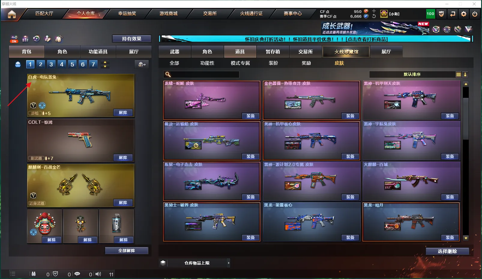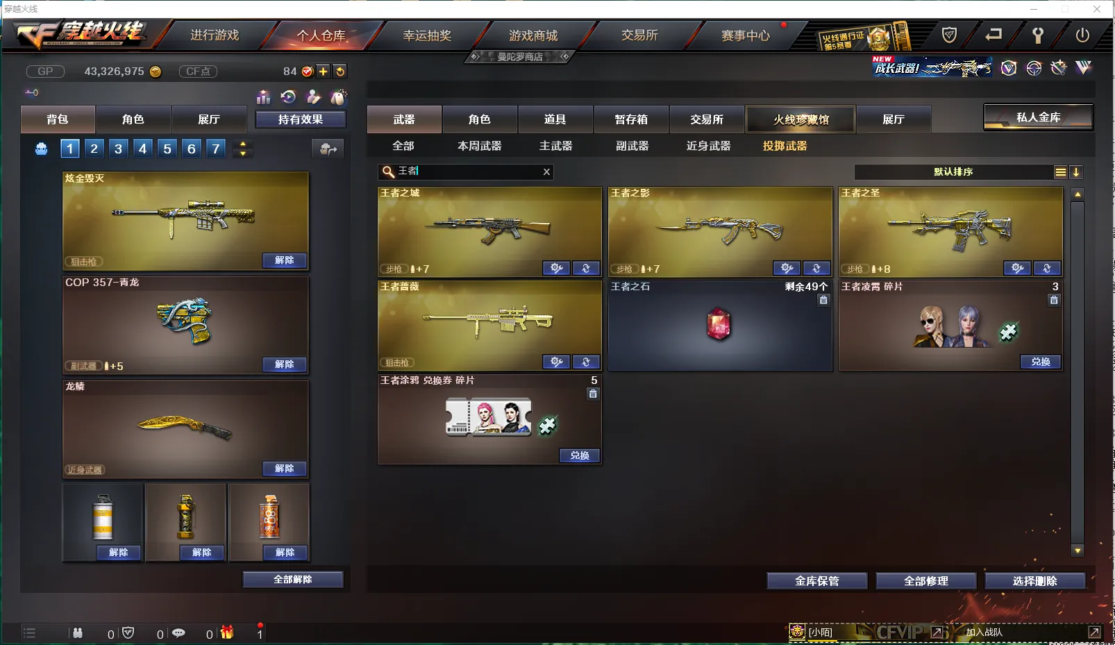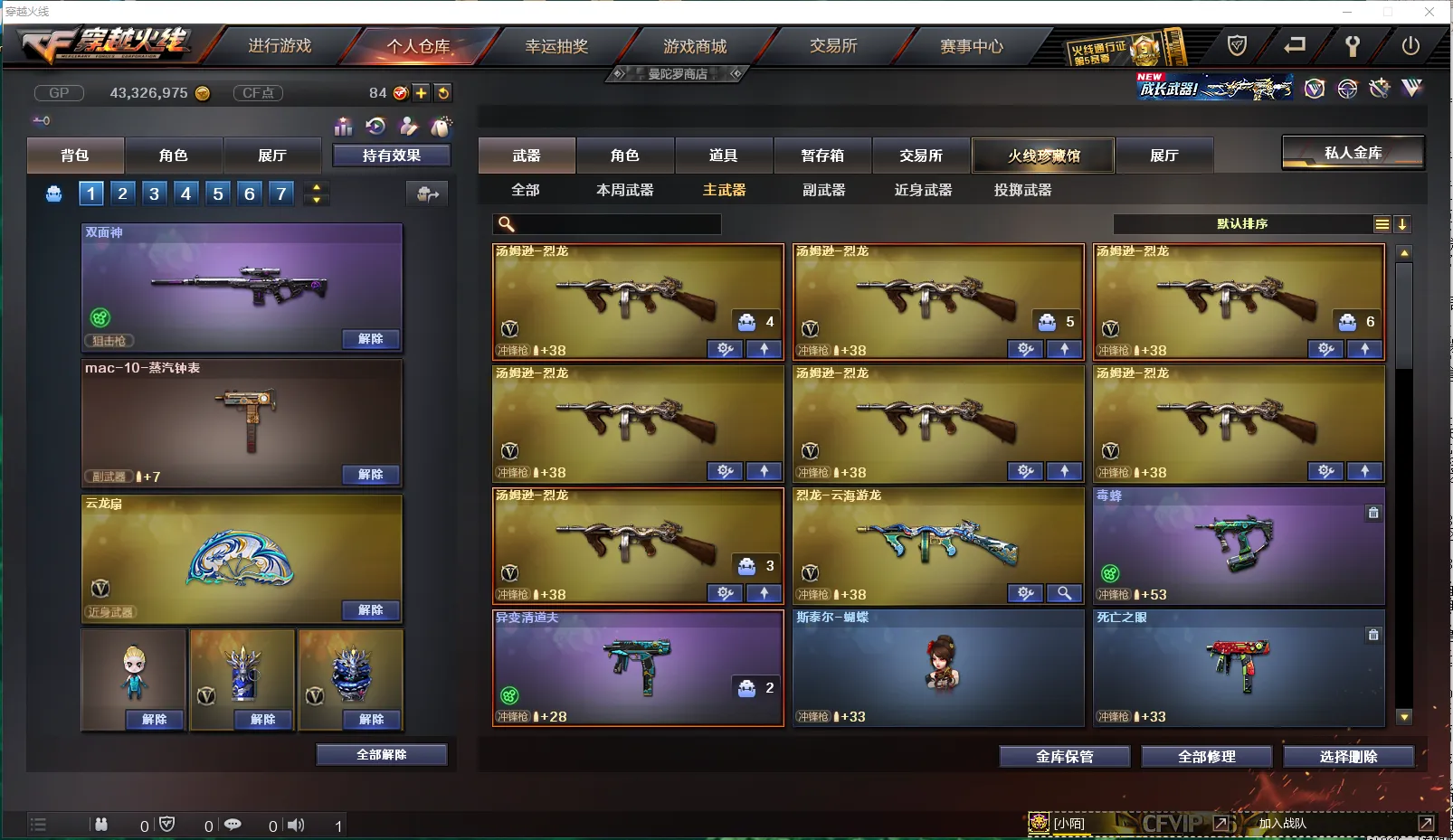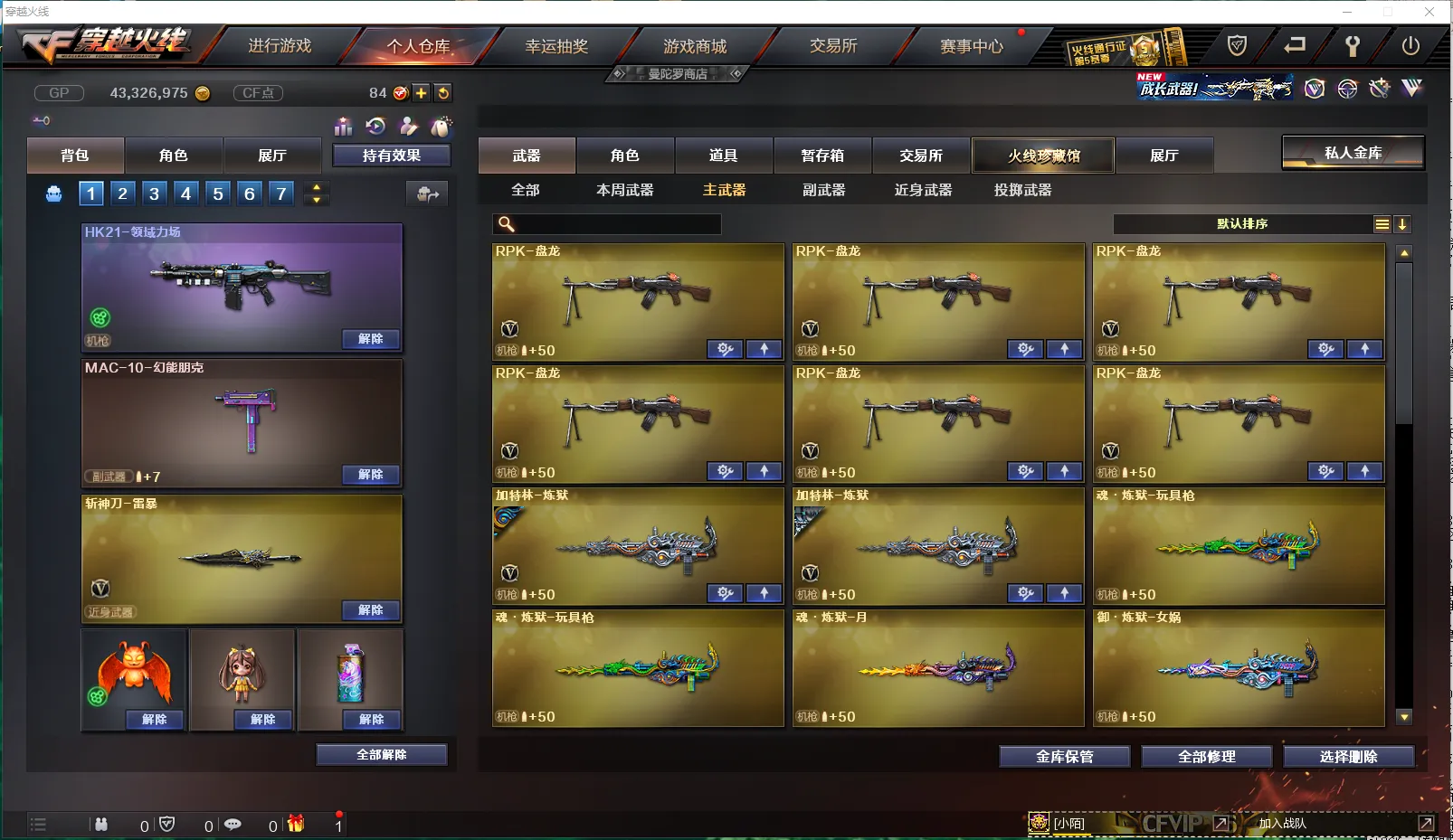【主武】:G36C-宇航兔兔、百城AK47、百城M4A1、百城AWM、9A-91-天蝎座、金牛座-典藏版、SL-处女座、M4A1-刀锋、HK417-赤血龙魂、M14EBR-赤血龙魂、黄金AK-47、黄金M4A1、黄金M14EBR、黄金9A-91、黄金AUGA1-A、黄金温彻斯特、黄金M4A1、破天九龙、破天狂龙、M200-青花瓷、M200-大黄蜂、M200-春桃、M200CheyTac-大圣、KAC-小动物、黄金KAC、加特林-H、加特林-蓝水晶、加特林-飞龙在天、MP5-SS、斯泰尔-恶棍、A180-蓝色骑士、EVOⅢ-赤血龙魂、EVOⅢ-锦绣游龙、EVOⅢ-黑金传说、EVOⅢ-萌杀、EVOⅢ-机甲核心、EVOⅢ-神兵利器、波波沙41-暗夜风暴、动力CPW-摸金校尉、斯泰尔-赤龙、斯泰尔-巧克力、贝雷塔687-射手座、AA-12-红色闪电、M37-恶棍、M37-礼花、M1216-暗金、SPAS-12-雷电核心、贝雷塔687-蓝色魅影、超级矮个子-蓝色骑士、贝雷塔687-迷彩