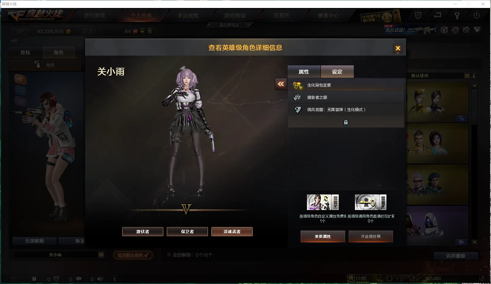 【角色】:初恋灵狐(佣兵觉醒:无需装弹、捕食者之眼、生化防化服)、斯沃特-X(佣兵觉醒:无需装弹、捕食者之眼、移动速度提升)、零-热舞青春、灵动武士、风暴女、虎妞、剑齿虎-X、救世主-X、灵狐者-七夕宝贝、龙儿-小淘气、潘多拉-甜心教官、社长刀锋、圣诞潘多拉-X(佣兵觉醒:无需装弹、捕食者之眼)、蜀雪、新猎狐者、雪莉杨-摸金校尉、樱-战斗天使、堕落女神、堕天使、雷霆-β、代号:翼、救世复仇、