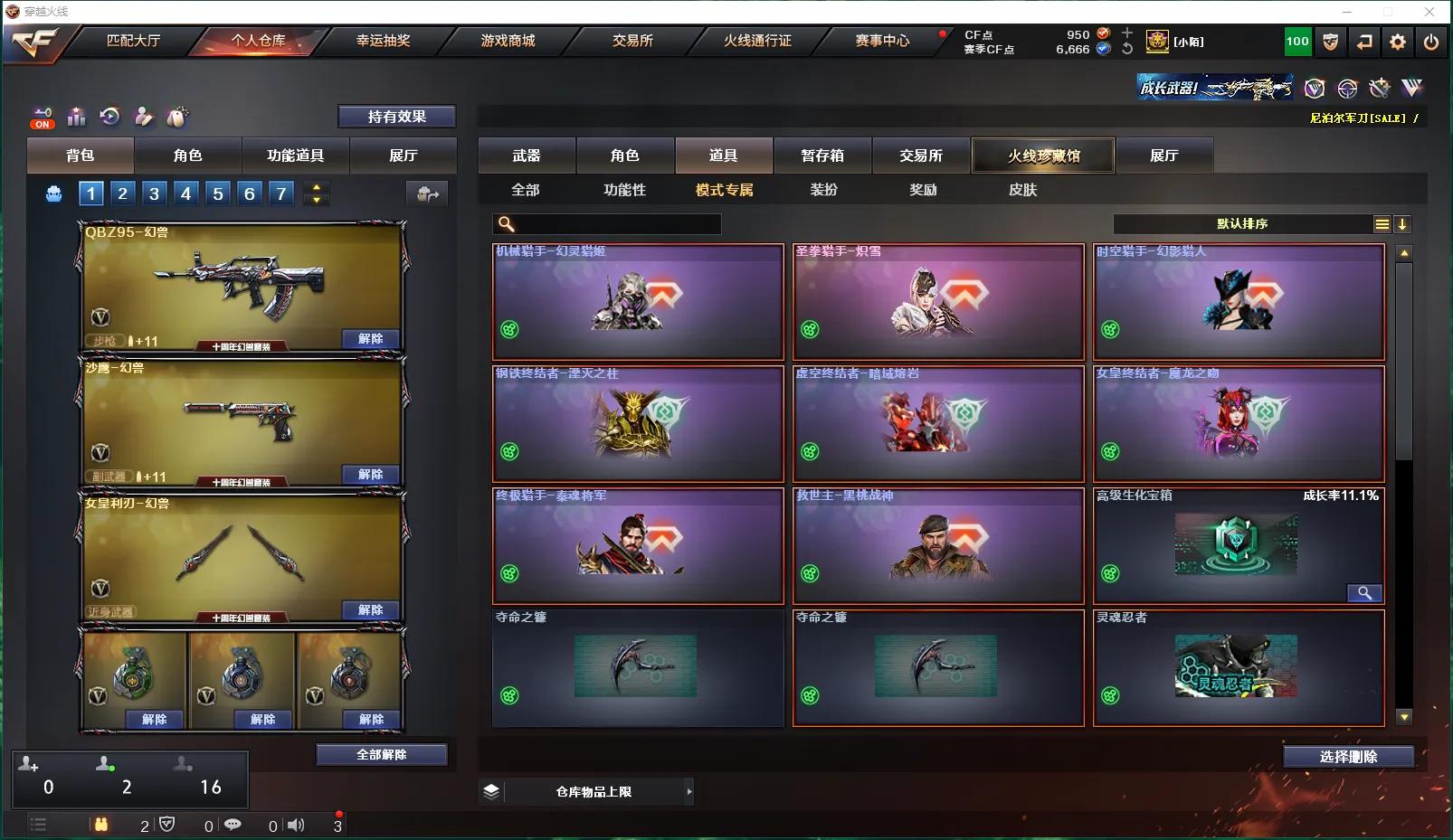 【挑战】:《主武器》:AK47-泰坦破坏者Ⅲ、冰龙粉碎者-白马银枪、激光毁灭者Ⅲ、激光毁灭者Ⅲ-白马银枪、乱世-超越2、神圣爆裂者-末日Ⅲ、征服者-超越2、神罚、M240B-苍雷、末日裁决者、《副武》:巡航者、《近武》:末日之拳、破天斩魔剑、双龙、双龙-秘银、斩神刀、夺魂、迷你波特博士、迷你深渊冰龙、魔能环、魔能镰刀、萨拉坦铁棍、死神之珠、唐刀-大唐荣耀、唐刀-盛世太平、《投掷》:反应堆手榴弹、魔花手雷、深渊终结者手雷、手雷-波特魔方、无尽空虚手雷、