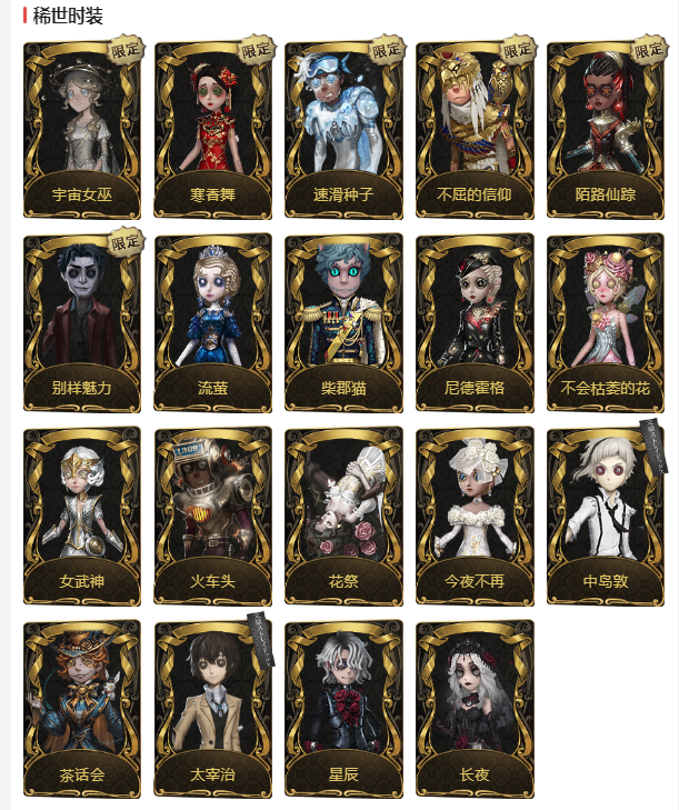 金皮34:盛夏光影 司药 鬼烛 冠军舵手 川上富江 招风旗:椰香假日 太宰治 中岛敦 变连王 宇宙女巫 寒香舞 速滑种子 陌路仙踪 欧律狄刻 星辰长夜 茶话会 夜来香 火车头 柴郡猫 流萤 不会枯萎的花 今夜不再 花祭 女武神 尼德霍格 不屈的信仰 拉塔托斯克 未至之人 片刻闲暇 盖提亚之遗 耶梦加得
