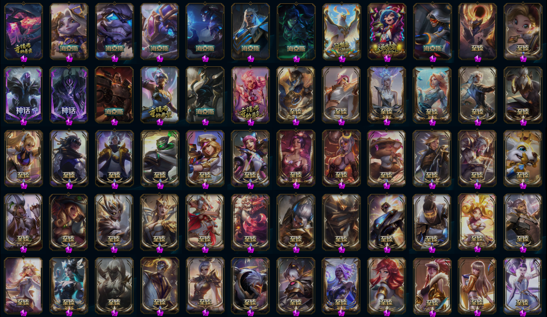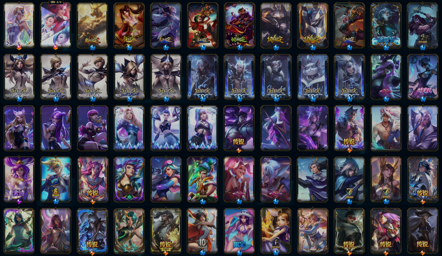 【传说皮肤】黯黑魔龙希瓦娜 黯晶凤凰艾尼维亚 暗星锤石 暗星女王拉克丝 暗星尊烬 奥德赛凯隐 霸天零式赛恩 霸天异形卡兹克 冰霜亚龙希瓦娜 冰霜之刃艾瑞莉娅 苍穹之光韦鲁斯 大天使长米迦勒凯尔 第三类接触黑默丁格 地狱行者孙悟空 地狱之门卫士加里奥 恶魔男爵瑞兹 符文战熊沃利贝尔 钢铁军团盖伦 钢铁之翼凯尔 光明哨兵格雷福斯 光明哨兵薇恩 灌篮高手德莱厄斯 鬼魂新娘莫甘娜 黑夜使者亚索 红色男爵库奇 枯萎之壤泽拉斯 炼狱魔犬内瑟斯 烈焰雄心崔丝塔娜 黎明使者锐雯 灵魂莲华锤石 灵魂莲华瑟提 陆地王者4WD布里茨 律政大亨蒙多 魔幻卡牌崔斯特 魔女伊芙琳 女帝卡特琳娜 女皇艾希 女警狙击凯特琳 女校长菲奥娜 女主播迦娜 偶像歌手阿狸 苹果机器人布里茨 蔷薇绅士杰斯 青花瓷伊泽瑞尔 日蚀骑士蕾欧娜 上古战魂魔腾 神龙尊者圣龙李青 神龙尊者夜月幻龙亚索 神龙尊者昼日真龙亚索 神拳李青 绅士科加斯 神王德莱厄斯 神王盖伦 双重冰晶艾尼维亚 死亡骑士盖伦 天煞劫 铁哥们儿奥拉夫 提莫约德尔人的一大步 屠龙勇士潘森 未来战士凯特琳 西部魔影卢锡安 西部天使艾希 西部天使赛娜 邪鸦魅影乐芙兰 星之守护者金克丝 星之守护者卡莎 星之守护者拉克丝 星之守护者霞 血石领主弗拉基米尔 驯龙学者黑默丁格 焰尾妖狐阿狸 影执事劫 银河魔装机神兰博 泳池派对吉格斯 源计划毁灭派克 源计划净化薇恩 源计划联合艾希 源计划林易 源计划泯灭雷克顿 约德尔国队长提莫 宇航员诺提勒斯 战场女武神凯尔 战地巨兽科加斯 战斗学院凯特琳 战斗学院伊泽瑞尔 真实伤害艾克 至尊魔女莫甘娜 最终BOSS维迦
