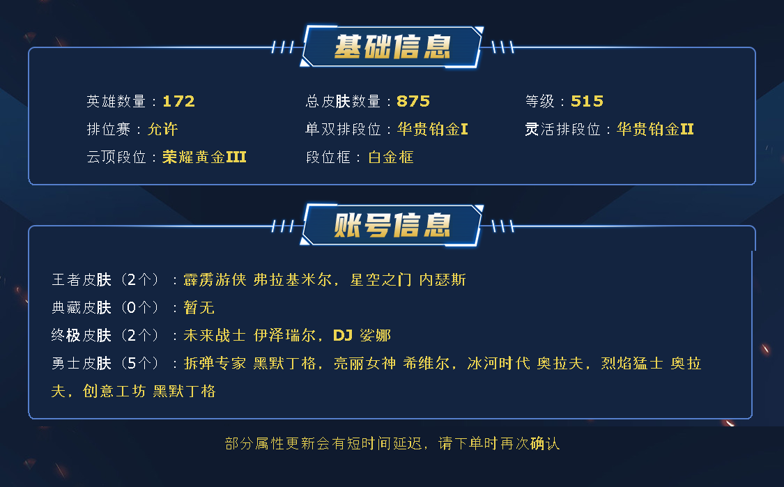 【全英雄可排位402原皮肤153炫彩皮肤】至臻刀妹、至臻塞拉斯、至臻婕拉、至臻EZ、海克斯乌鸦、海克斯炸弹人、海克斯波比、海克斯大嘴、剪纸仙灵刀妹、神凰行者霞、鼠年武器、星守佐伊、玉剑男刀、玉剑刀妹、狗年光辉、电玩锐雯、龙琴、羊年金克丝、青花瓷EZ、光明哨兵薇恩、战斗学院女警、灵魂莲华阿狸、灵能特工琴女、神龙尊者瞎子、战斗学院EZ、永恒之森奥恩、EDG厄斐琉斯、EDG佛耶戈、穿心之剑剑姬、养蜂人、泳池皇子、泳池女警、情人节辛德拉、征服者卡尔玛、DWG卡牌、至高天烬、至高天薇古丝、净雪之月凯隐、战斗学院永恩、咖啡甜心格温、咖啡甜心希维尔、莫测之影卡蜜尔、幽梦玫瑰泽丽、太空律动兰博、太空律动狗头、太空律动莎弥拉、破败军团德莱文、狮子星神豹女、猎户星神韦鲁斯、灵魂莲华永恩、灵魂莲华亚索、灵魂莲华薇恩、新K/DA阿卡丽、新K/DA卡莎、神龙尊者瑟提、灵能特工派克、灵能特工EZ、永恒之森霞、屠龙勇士巨魔、屠龙勇士老鼠、古神梦魇、黑暗骑士赵信、冠军之隐、破空枪骑、万圣节卡特、甜心之羽霞、泳池岩雀、奥德赛凯隐、暗星尊烬、黎明奶妈、神拳、神王诺手、天煞劫、屠龙勇士潘森、西部天使寒冰、真实伤害艾克