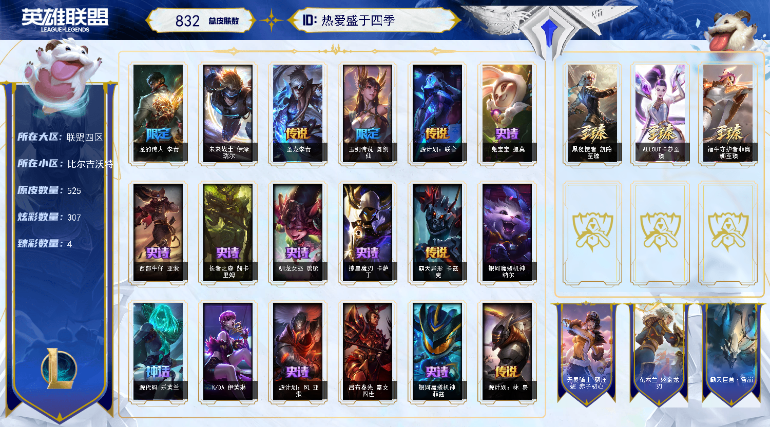 【比尔吉沃特453原皮】至臻凯隐丶新至臻卡莎丶至臻剑姬丶龙年瞎子丶虎年皎月丶马年皎月丶猪年塔姆丶龙瞎
