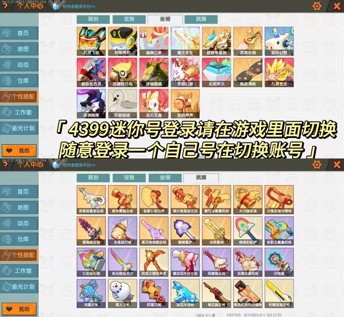 【安卓】 4399迷你号登录❤18坐骑❤云朵绒绒❤天幕星龙❤暮光落霞惋惜❤秘境精灵西亚❤声波大黄蜂超多武器皮肤