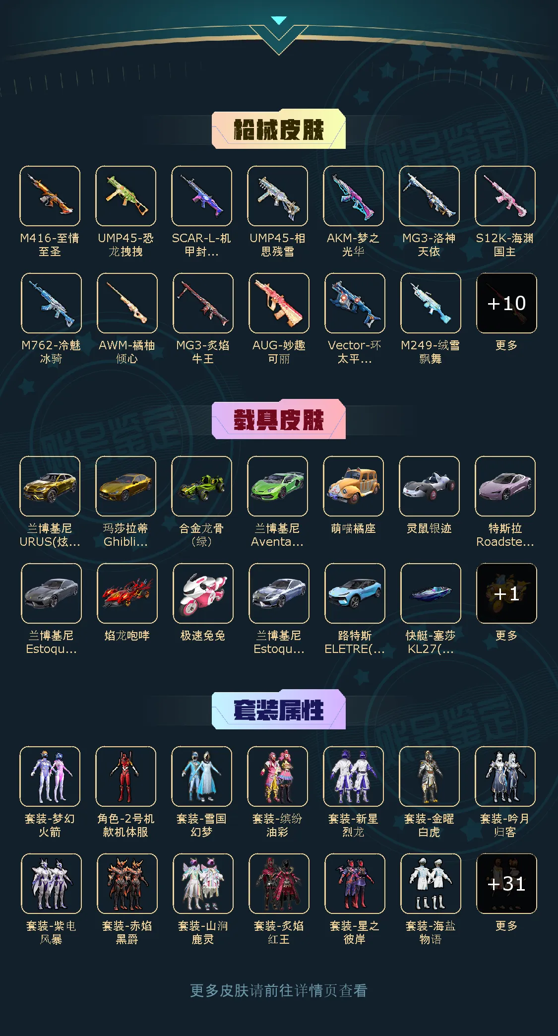 260套装 271枪皮 【15载具】 玛莎拉蒂金色 兰博SUV金色 兰博轿车尊享铂 路特斯EL蓝色 兰博轿车灰色 兰博SVJ绿色 特斯拉R沁心粉 合金龙骨绿色 灵鼠银迹 焰龙咆哮 拉轰鸭鸭车 萌喵橘座 塞莎深潜蓝 (1级) 极速兔兔车 空客蔚蓝之翼僚机 【4稀有】 木乃伊 奇异狩猎者 AKM-缤纷海域 浪漫天命 【44粉装】 红螳螂 梦幻火箭 雪国幻梦 洛天依 金曜白虎 妙趣可丽 缤纷油彩 星之信仰 橘柚倾心 纯珍童话 新星烈龙 暗夜鎏金 香水柠檬 绚金战神 童趣迷兔 星夜魔法师 炙焰红王 霞光圣骑 圣光天使 暗翼战神 绮梦青鸾 星之彼岸 相思残雪 馨动时刻 炙焰赤龙 飓风飞鹰 赛罗闪耀型 海螺星光 旋转彩虹 紫电风暴 赤焰黑爵 冷魅冰骑 枪炮玫瑰 蜜桃特工 蝶舞蔷薇 海盐物语 独舞天鹅 桀骜红莲 林间仙鹿 山涧鹿灵 彩虹鹿灵 吟月归客 寒光使者 碧影闪光 【24特效枪】 M416-五爪金龙 () M416-心之恋语 () Kar98K-巳巳如意 () Kar98K-伏魔团 () AWM-橘柚倾心 () GR