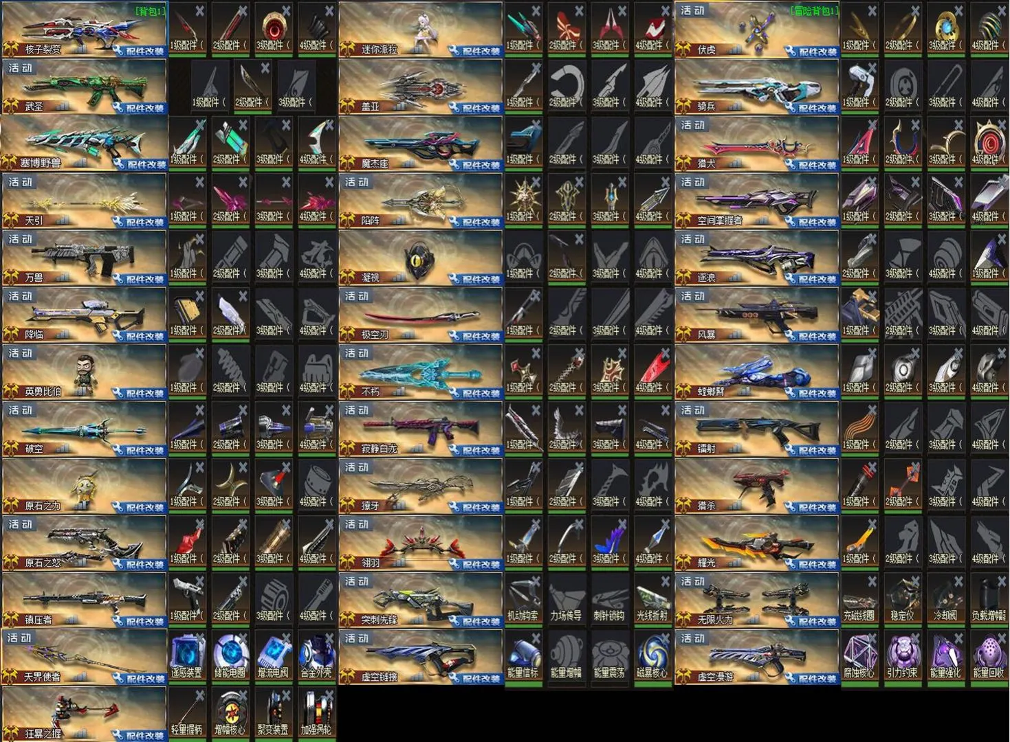 核子裂变满配✅迷你派拉满配✅伏虎满配✅武圣1配⭐盖亚1配⭐骑兵1配⭐塞博野兽满配✅魔杰座1配⭐猎犬满配✅天引满配✅陷阵满配✅空间掌握者满配✅万兽1配⭐凝视1配⭐逐浪2配⭐降临2配⭐极空刃1配⭐风暴1配⭐英勇比伯1配⭐不朽满配✅螳螂臂满配✅破空满配✅寂静白龙满配✅镭射1配⭐原石之力3配⭐獠牙2配⭐猎杀2配⭐原石之怒满配✅翎羽满配✅耀光1配⭐镇压者2配⭐突刺先锋2配⭐无限火力满配✅天界使者满配✅虚空链接2配⭐虚空漫游满配✅狂暴之握满配✅精彩配件武器欢迎体验✨