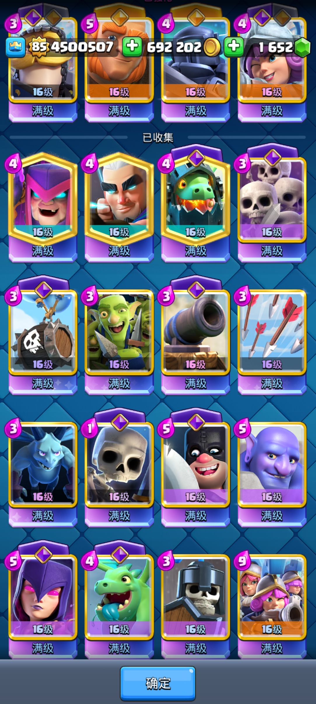 卡牌基本全16级满级,解锁全部觉醒卡,所有卡金皮肤全满,有满级厨师塔,刀塔,炮塔,公主塔,新赛季钻石令牌,还有超多稀有表情,超多皇家塔皮肤,五百万金星点,五百万金币,三万多钻石,国服NO.1部落长老,经典挑战勋章,锦标赛,天梯五百名勋章都有~
