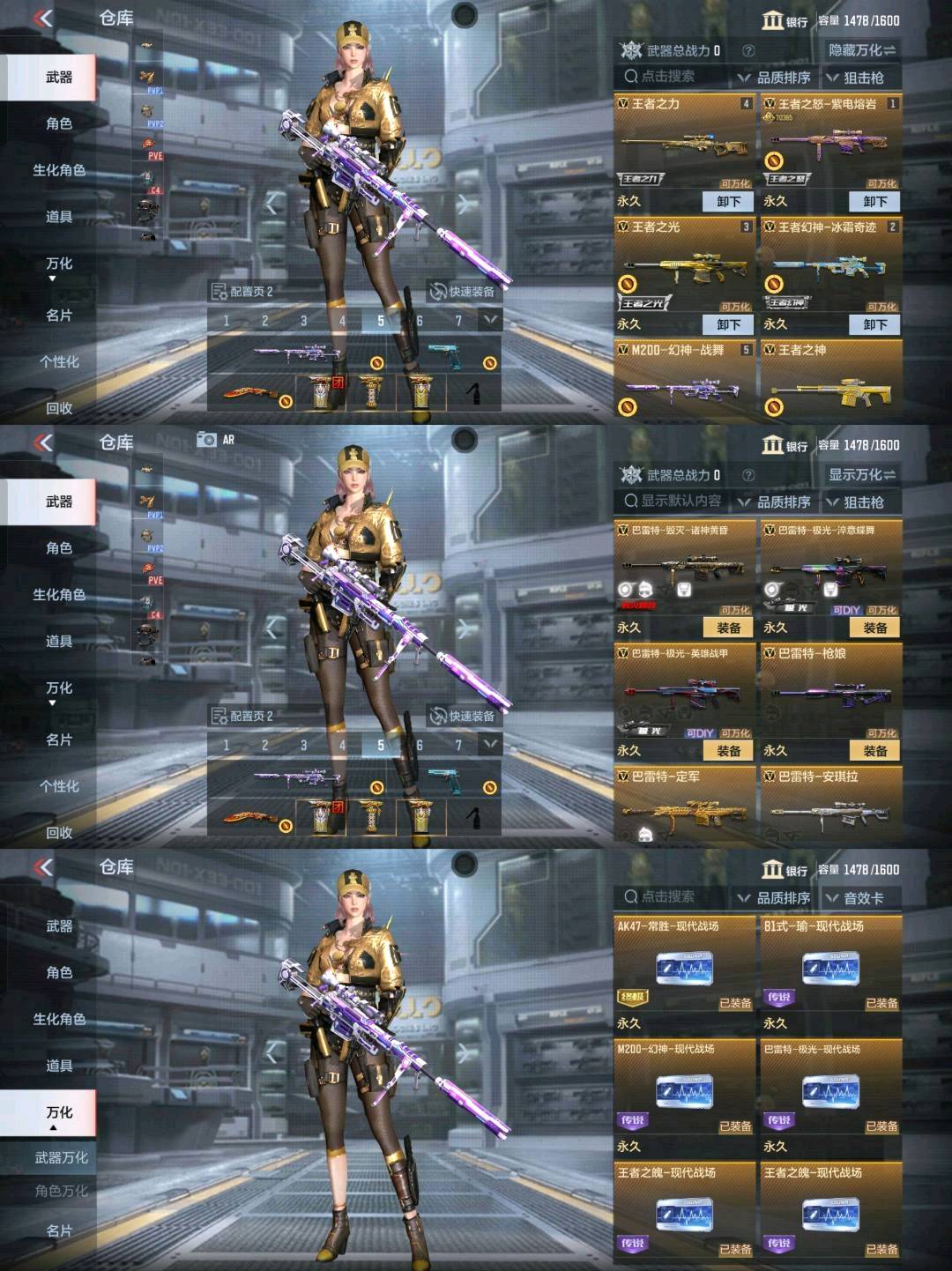 🔥狙击枪:❤🔥王者之怒-紫电熔岩❤🔥王者之力❤🔥王者之光❤🔥王者之神❤🔥M200-幻神-战舞❤🔥巴雷特-定军❤🔥AWM-妙才❤🔥巴雷特15把❤🔥等省略