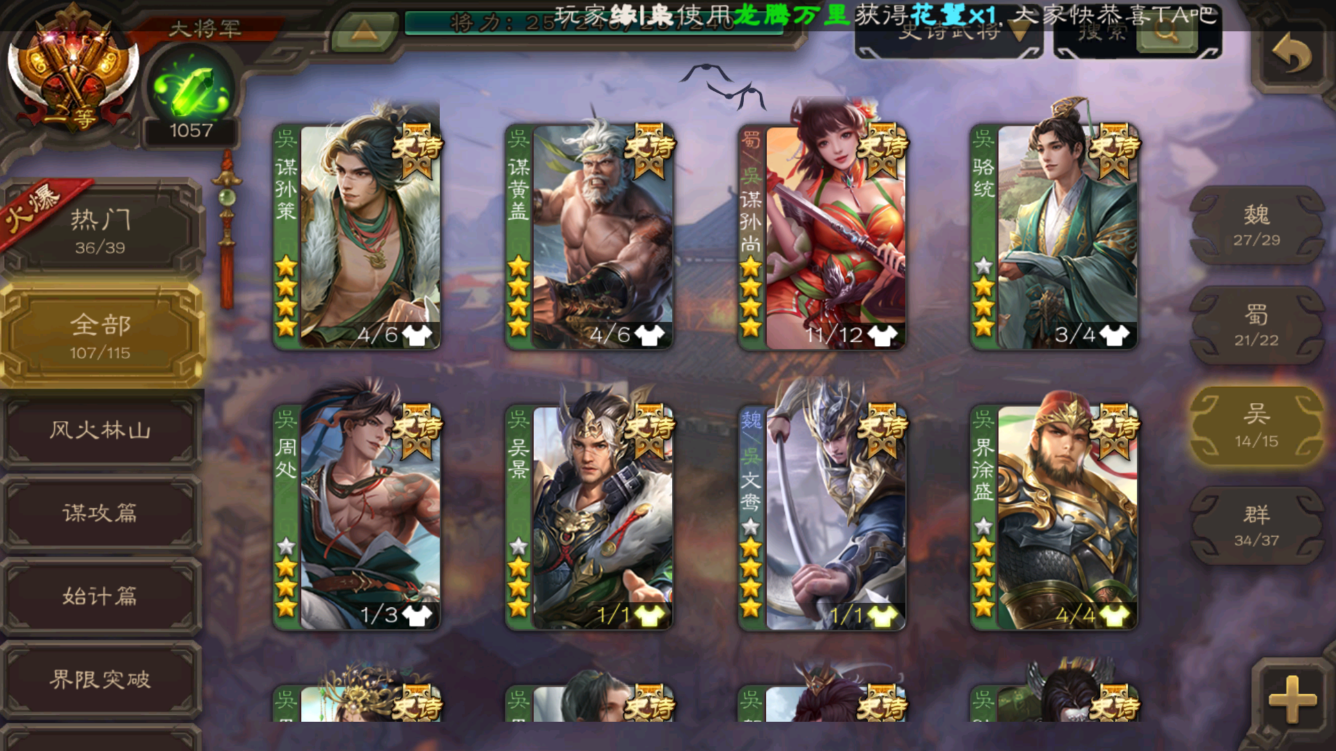 全扩全武将一等大将军谋夏侯惇回廊郭嘉双形态回廊动杜预弼朝博虬回廊动神郭嘉倚星折月回廊动界钟会动谋曹丕回廊动文鸯动谋关羽动刘焉回廊动徐荣动神曹操动神甘宁回廊动神荀彧动神孙策动谋黄忠动谋黄盖动孙寒华回廊动谋貂蝉动杨彪张仲景动谋曹操回廊动谋曹仁国之柱石动张菖蒲动戏志才动曹婴王朗动王元姬动羊徽瑜郭女王动马钧动谋刘备动谋夏侯氏动谋孙尚香动鲍三娘傅佥动谋孙策骆统动大宝动留赞皇甫嵩动界左慈动界李儒界沮授回廊动白马动卑弥呼动张琪瑛裴秀动祢衡动庞德公动南华老仙动神吕布动神赵云动神陆逊动神太史慈神华佗双形态回廊文鸯双形态回廊动文鸯回廊双形态动文鸯破宇开天