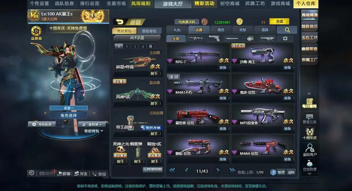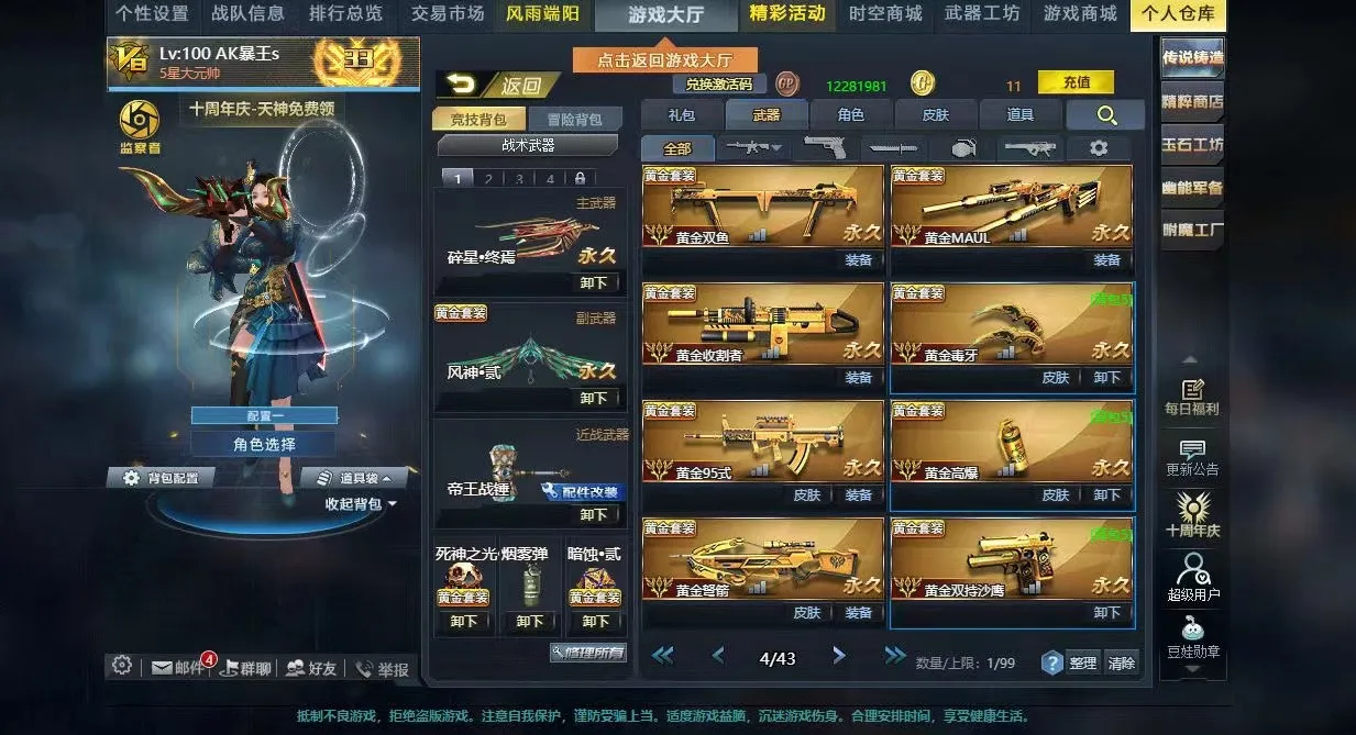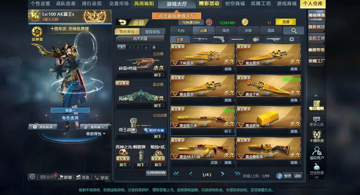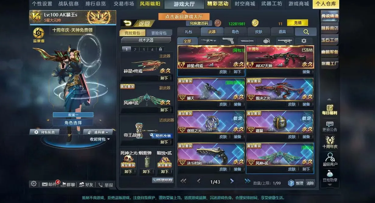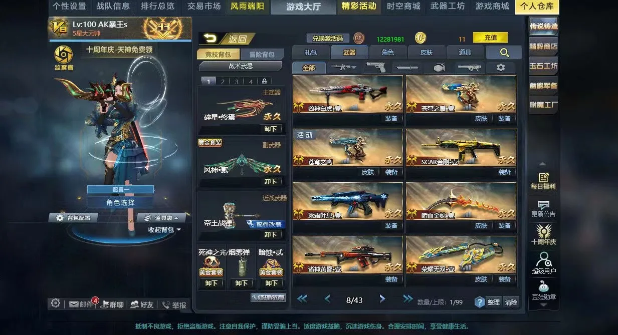 V8双传说碎星终焉风神贰满配裂隙行者AK天神裁决之炎撼天决斗时刻深渊之刃大量黄金武器