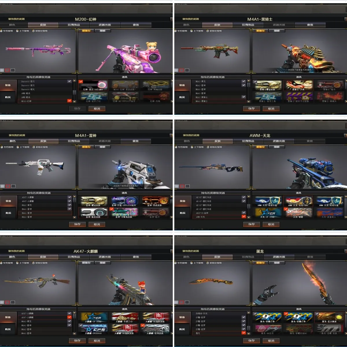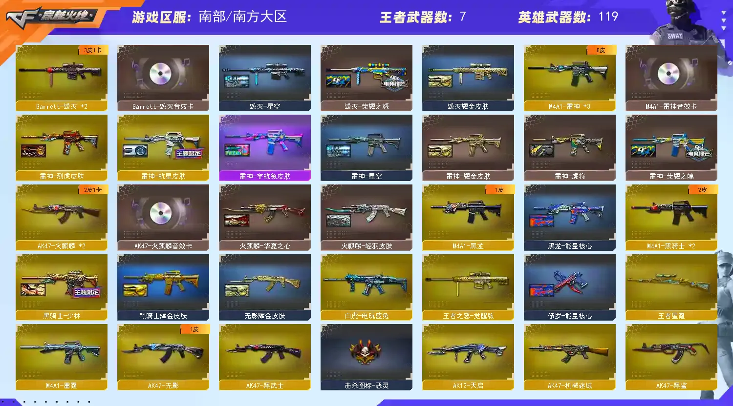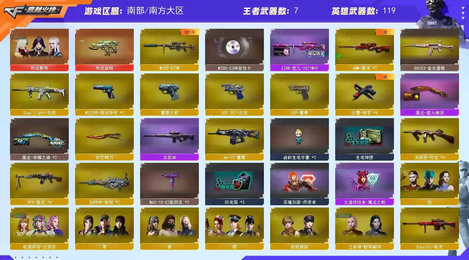 【重要武器皮肤】幻神-宠儿-2021MVP/雷神-航星皮肤/龙啸-冠军之啸/毁灭-星空/毁灭-荣耀之怒/毁灭耀金皮肤/AWM-天龙-传奇70KG/AWM-天龙-传奇白鲨/天龙-CFSTAR/天龙-秘银/M4A1-雷神-白鲨皮肤/雷神-荣耀之魄/雷神-虎将/雷神-耀金皮肤/雷神-宇航兔皮肤/雷神-烈虎皮肤/雷神-星空/黑骑士耀金皮肤/黑骑士-少林/黑龙-能量核心/火麒麟-CFSTAR/火麒麟-AG/火麒麟-华夏之心/火麒麟-轻羽皮肤/无影耀金皮肤/AK47-B-常胜将军-曹操/战神-流金岁月皮肤/战神-紫绶金章皮肤/战神-粉色甜心皮肤/修罗-CFSTAR/修罗-能量核心/屠龙-荣耀之锋/屠龙-星火燎原