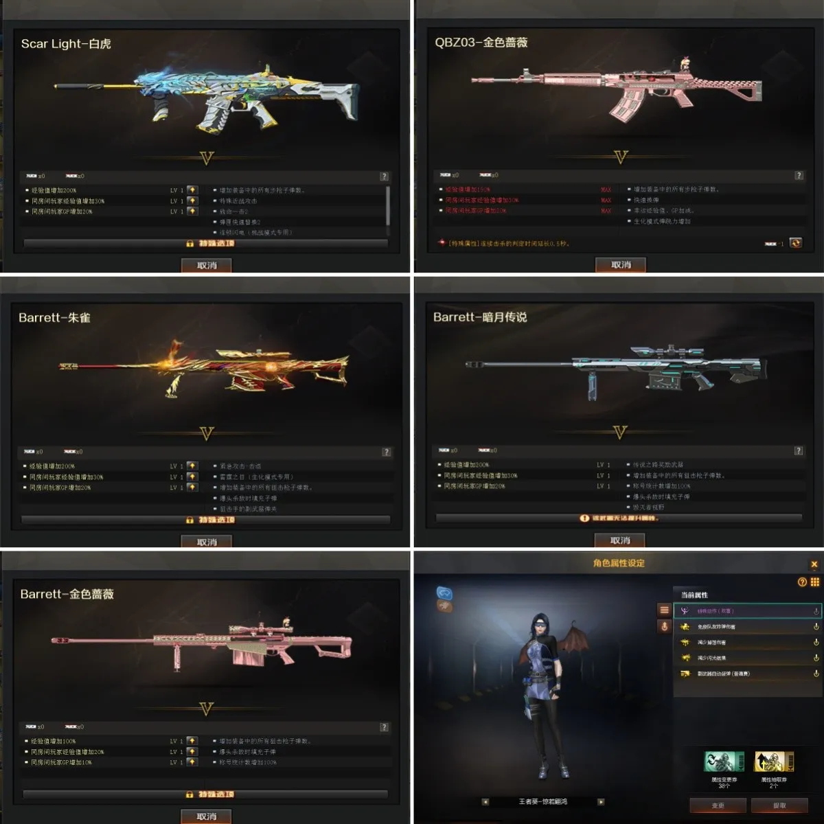 【重要光效】王者之怒金色光效/AK47-黑武士蓝色光效/屠龙蓝色光效/沙鹰-修罗蓝色光效/AK47-火麒麟蓝粉色光效/M200-幻神蓝粉色光效/M4A1-雷神蓝粉色光效/加特林-炼狱蓝粉色光效/AK47-无影-红绿光效/Barrett-毁灭红绿色光效/Barrett-极光紫橙光效/M4A1-雷神紫橙光效/王者之心紫色光效