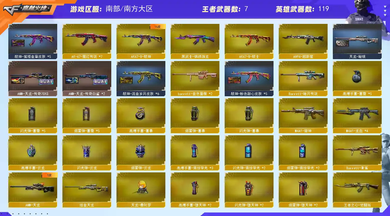 【其他重要武器】炫金武士/M4A1-十二生肖·龙-雷神/激光毁灭者III-白马银枪/AK-12-CFS2017纪念版(2)/AK47-轮回/M4A1-秘银赤龙/AK47-肯德基/9A91-2017万圣节/M4A1-SS-枪王排位/AK47枪王排位II(2)/黄金AK-47(2)/M14EBR-情人节2020/AK47-破空冰刃(2)/AK47-十年火线/9A91-赤血龙魂(2)/AK-103-红色悦动(2)/HK417-红龙/9A91-蓝色骑士/M4A1-PINK/M4A1-狂欢-CFS/AK47-狂欢-CFS/M4A1-战龙(2)/AK47-枪娘/海浪AK47-Q浏览器/AK47-丹龙/百城AK47(2)/M4CQBR-AP-孔明/AK47-大帝林肯/AK47-朋克/M4A1-樱花/M4A1-紫狱/G3A3-SS-枪王排位/AK-47-二次元(2)/AK47-苍龙/AK47-娜塔莎/M4A1-圣诞2021/QBZ03-锋芒破茧/M200-万圣节2018/M200-万圣节/AWM-圣诞/AWM-恶棍-枪王排位(2)/M200-赤血龙魂(2)/M200-牡丹/AWM-红色悦动/巴雷特-情人节2020/雷蛇AWM/AWM-T/M200-情人节2019/AWM-涂鸦/M200-圣诞/AWM-恶棍/AWM-7周年/M82A1-封神/M200-青帝/AWM-A-圣诞2021/双面神/M200-青花瓷/黄金AWM/M82A1-飞龙在天/末日裁决者/巨龙咆哮Ⅲ/EVO III-赤血龙魂(2)/EVOIII-萌杀(2)/EVO3A1-火线13周年/斯泰尔-CFS2017纪念版/试炼破坏者III/神圣爆裂者-末日/SPAS-12-雷电核心/AA-12-圣龙/Spas-12-幻能朋克/Anaconda-万圣节2019(2)/Anaconda-炽焰核心(3)/凤凰之火/Cop357-赤龙(2)/COP 357-青龙/沙鹰-青龙/Anaconda-雷电核心(2)/沙鹰-雷蛇/COP 357--绚樱(2)/沙鹰-枪王排位/Anaconda-黑金神龙/MAC-10-幻能朋克(2)/USP-黑大圣/COP-机甲刑天/COP 357-平天大圣(2)/Mauser M1896-CFS 2020/迷彩沙鹰-70KG/新USP-枪王排位奖励(5)/沙漠之鹰-炎龙/COP-青帝(2)/金刚伞-电玩红兔/丛林匕首-卧龙(4)/啸天/丛林匕首-枪王排位/军用铁锹-赤龙/魔能镰刀/尼泊尔军刀-战龙/幻影双斧-枪王排位/红色诅咒娃娃手雷(2)/闪光弹-枪王排位(3)/手雷-能量核心(2)/胜利奖杯烟雾弹-枪王排位(2)/胜利奖杯手雷-枪王排位