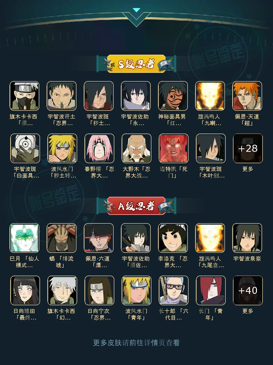 A级忍者(44个):宁智波触,飞段「死司凭血」,角都,飞段,我爱罗「疾风传」,飞阿斯玛「秽土转生」,迪达拉,蝎,迈特凯,猛飞阿斯玛,干杮鬼鲛。宇智止水,小南,旗木卡卡西「万花筒写轮眼」,角都「地怨鹰」,漩涡鸣人「仙人模式」,宇智波佐助「万花筒写轮眼」,猿飞H斩「火影继承人」,照美冥「五代日水!,勘九郎「忍界大战!,春野樱「白豪!,大蛇夷「晓」,秋道丁次「忍界大战」,小南「夏日泳装」,我爱罗「忍界大战」,药帅兜「半蛇斗」千代「近松十人卫」,瀧涡鸣人「九尾査克拉」,猿飞木叶丸「博人传」,宇智波带土「墨怒」迪达技T秽士转生」,宁智波佐助