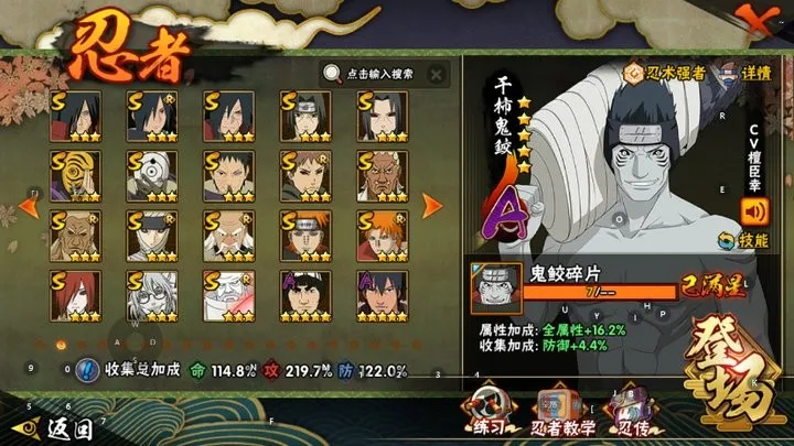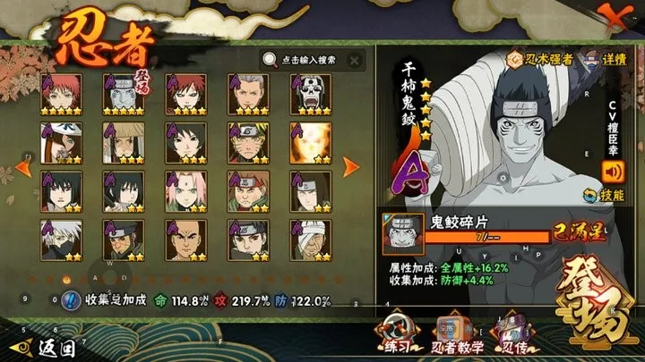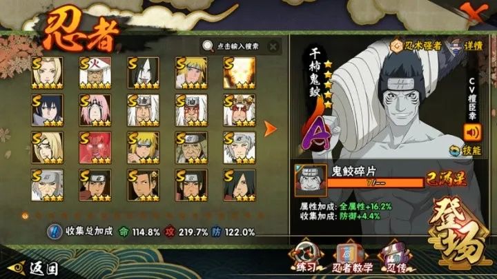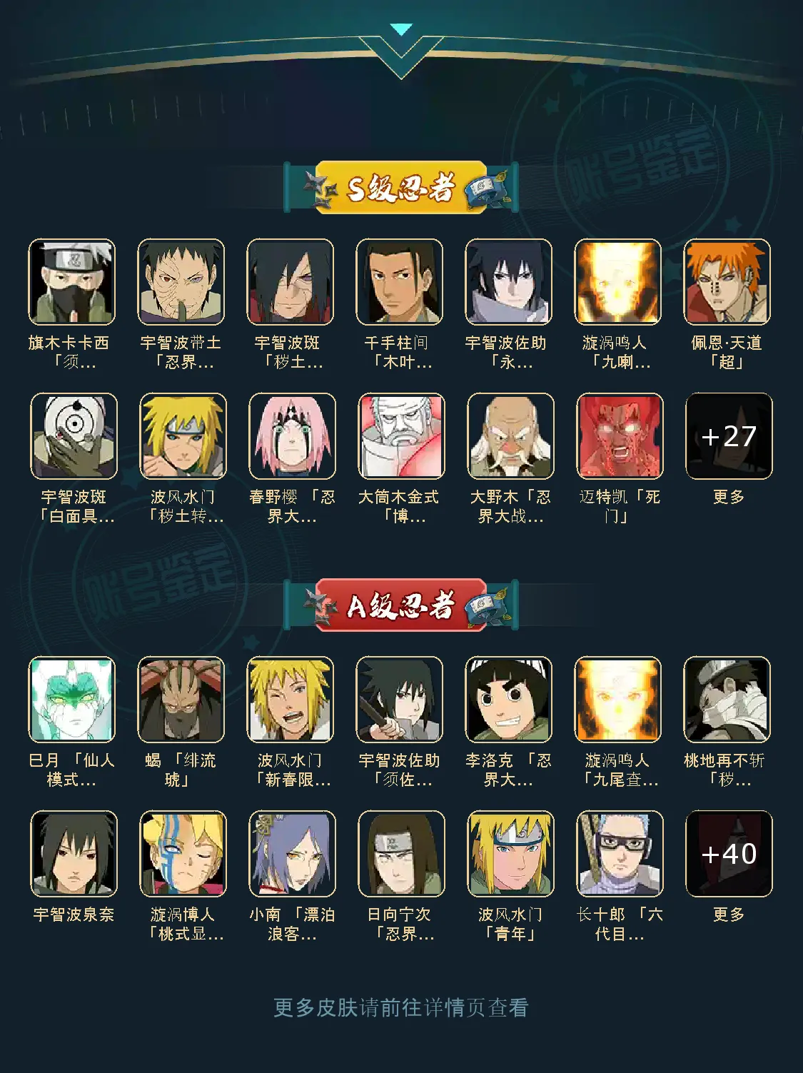 A级忍者(46个):宇智波鼬,飞段「死司凭血」,角都,飞段,我爱罗「疾风传」,猿飞阿斯玛「秽土转生」,波风水门「新春限定」,迪达拉,蝎,迈特凯,猿飞阿斯玛,干杮鬼鲛,宇智波止水,小南,旗木卡卡西「万花筒写轮眼」,角都「地怨虞」,漩涡鸣人「仙人模式」,奇拉比,志村团藏,宇智波佐助「万花筒写轮眼」,猿飞日斩「火影继承人」,照美冥「五代目水影」,春野樱「百豪」,大蛇丸「晓」,秋道丁次「忍界大战」,我爱罗「忍界大战」,地陆,宇智波鼬「新春限定」,药师兜「半蛇斗篷」,千代「近松十人卫」,漩涡鸣人「九尾查克拉」,猿飞木叶丸「博人传」,迪达拉「秽土转生」,宇智波佐助「须佐能乎」,黑土「博人传」,奇拉比「忍界大战」,千手犀间「漂泊武士」,波风水门「青年」,不风,达鲁伊「博人传」,艾「青年」,长门「青年」,长十郎 「六代目水影」,日向宁次 「忍界大战」,小南 「漂泊浪客」,漩涡博人「桃式显现」
