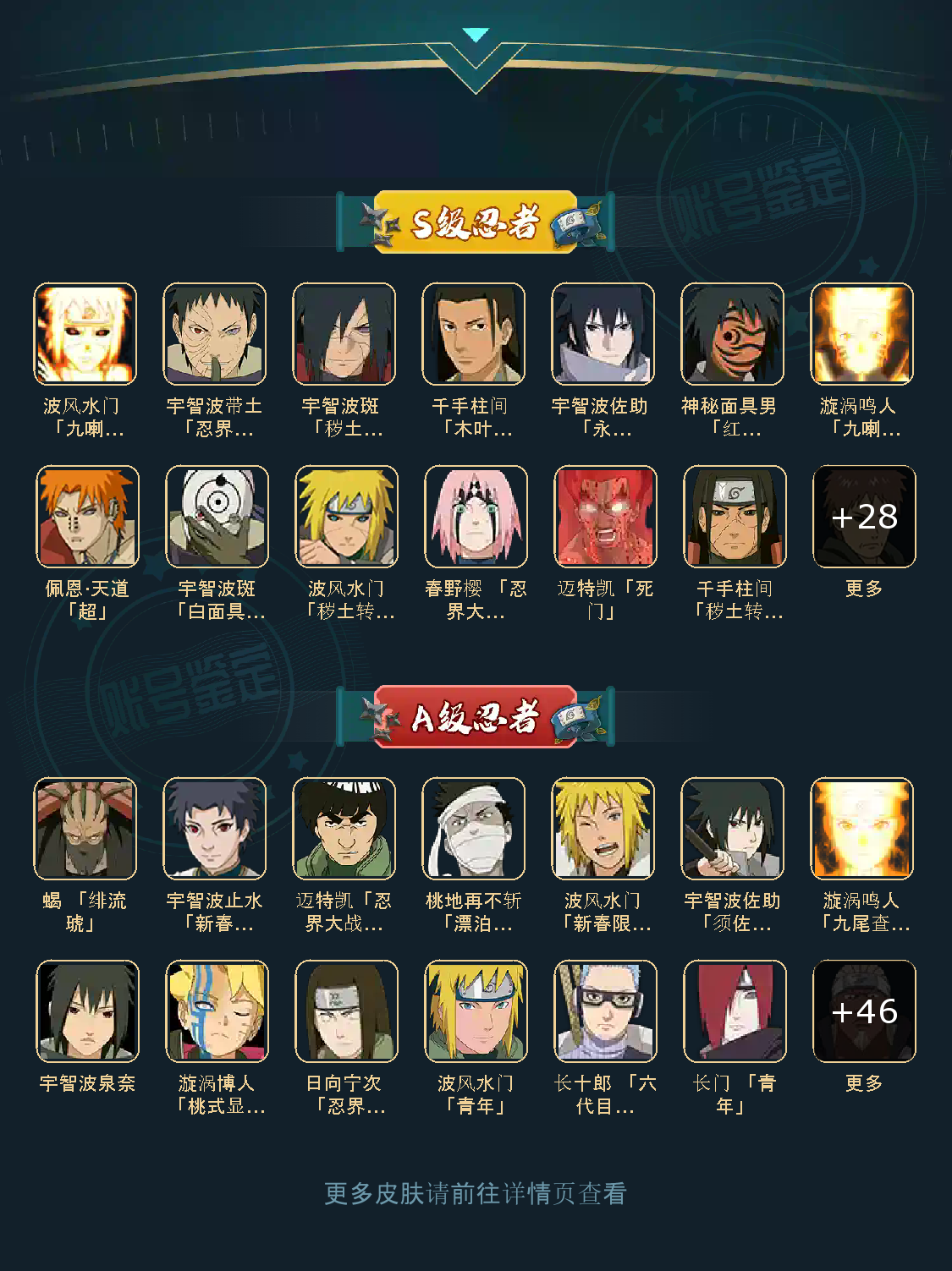 【40S忍者55A忍者1872W战力-12高招券】纲手 日斩 大蛇丸 水门 九喇嘛鸣人 永恒佐助 自来也 仙人自来也 舞杰自来也 百豪纲手 s门凯 秽土水门 秽土日斩 秽土扉间