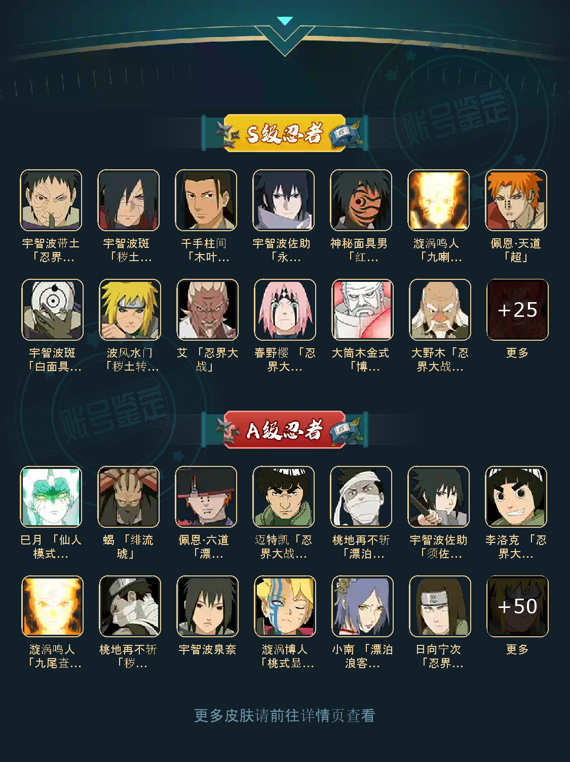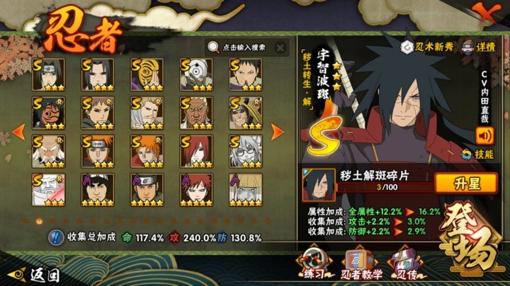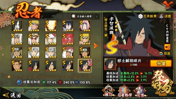 V14/战力1330W/S忍36/A忍56/通灵兽15/宇智波斑「秽土转生」/纲手「百豪」/宇智波佐助「永恒万花筒」/宇智波带土 「忍界大战」/“宇智波斑” 「白面具」/千手柱间·木叶创立/佩恩「天道」/猿飞日斩「秽土转生」