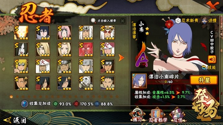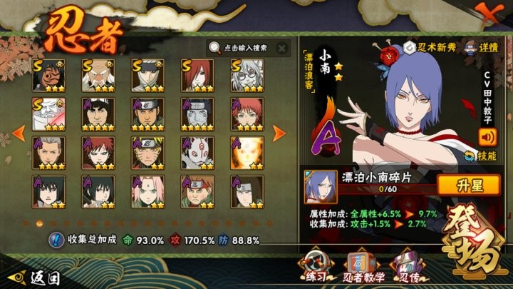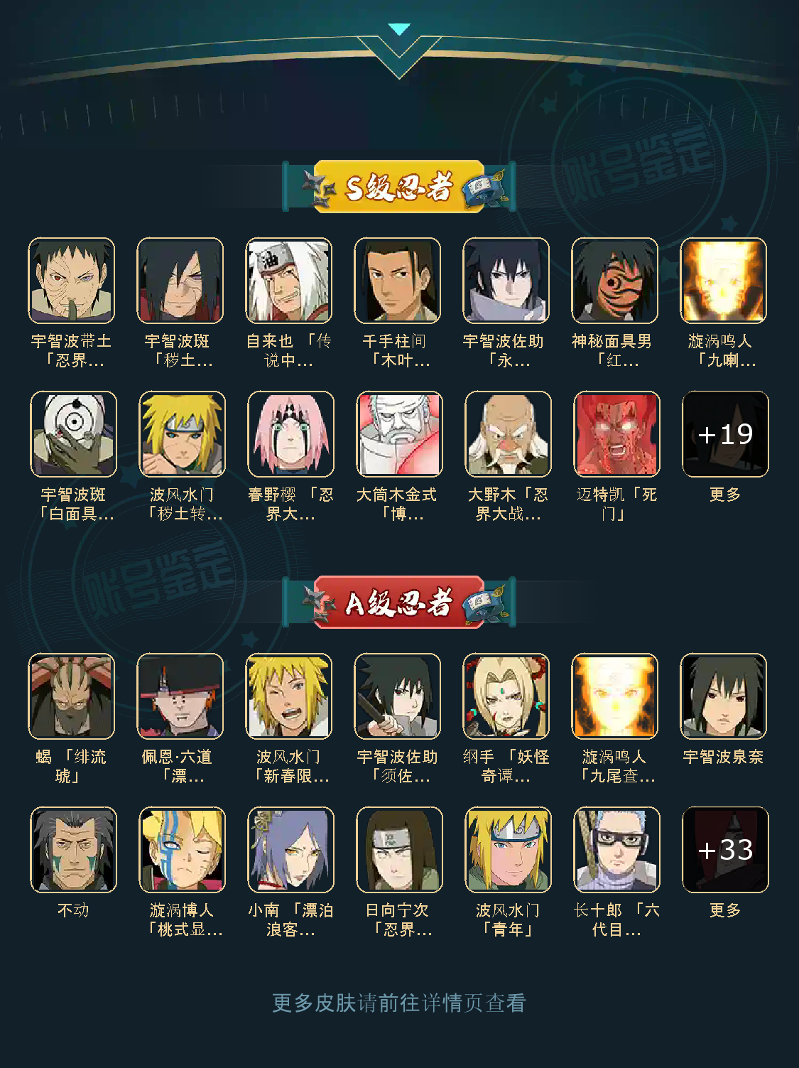 战力:1232W+;S忍31个;A忍40个,通灵兽18个,S忍:九喇嘛鸣人永恒万花筒佐助忍战樱普通自来也豪杰自来也大蛇丸普通纲手百豪纲手死门凯波风水门秽土水门猿飞日斩秽土猿飞秽土扉间千手柱间木叶创立柱间秽土斑木叶创立斑白面具忍战带土红夜面具