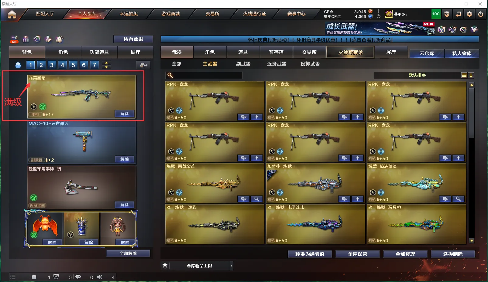 【挑战】:《主武器》:QBZ03-天罚、激光毁灭者Ⅲ、神圣爆裂者Ⅲ、神罚、M240B-苍雷、末日裁决者、《副武》:巡航者、《近武》:龙泉剑-CFS2024、末日之拳、轩辕剑-狐妖、芭蕉扇、夺魂、迷你牛牛、唐刀-戎马一生、特工之刃、伪装之锋-暗、虚空之槌、《投掷》:疾爆手雷-电子连击、手雷-裂空之翼、无尽虚空手雷、疾爆手雷-河马、