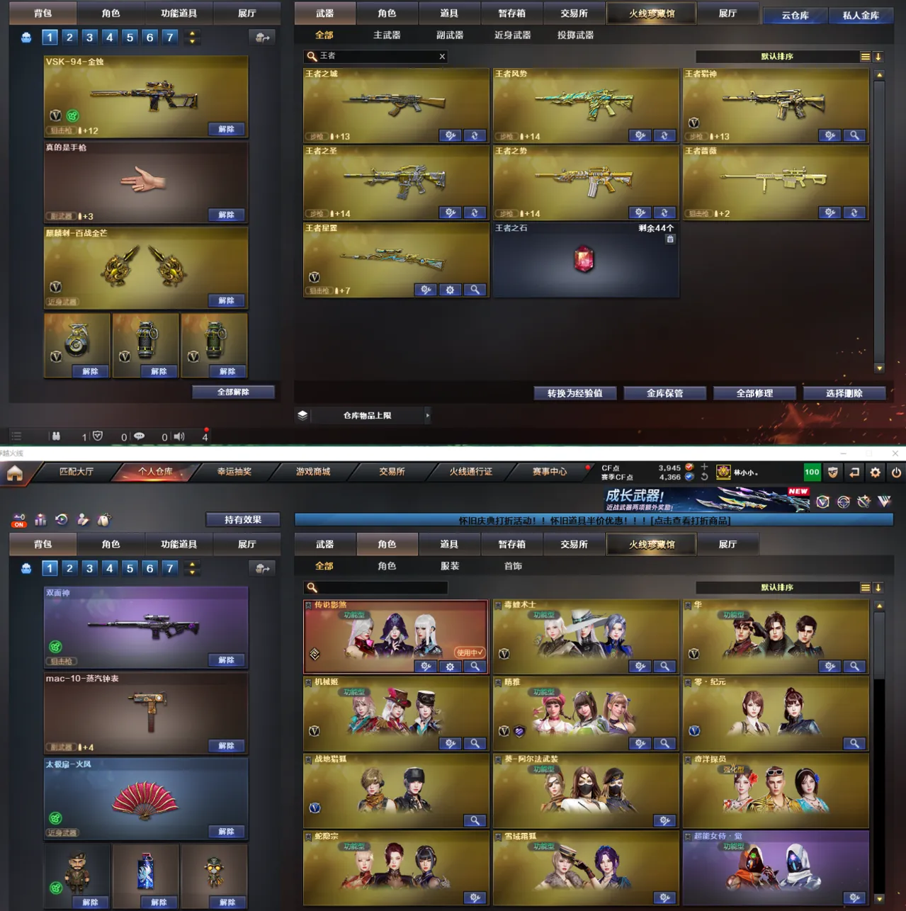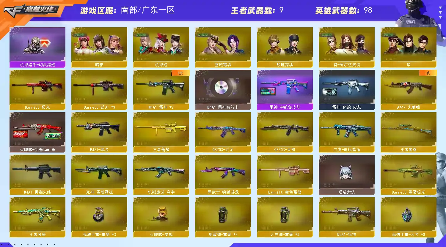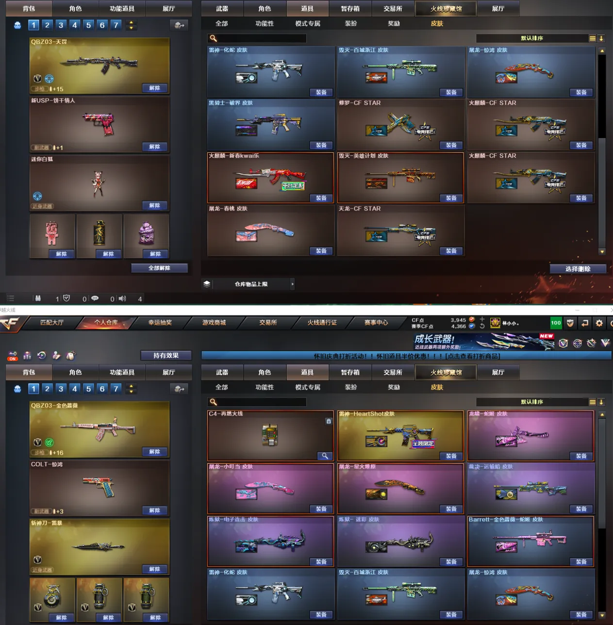 【皮肤】:雷神-HeartShot皮肤、屠龙-星火燎原、龙啸-蛇姬皮肤、屠龙-小叮当皮肤、炼狱-电子连击皮肤、炼狱-迷城皮肤、雷神-化蛇皮肤、屠龙-惊鸿皮肤、毁灭-百城浙江皮肤、黑骑士-破界皮肤、Barrett-金色蔷薇-蛇姬皮肤、毁灭-英雄计划皮肤、屠龙-春桃皮肤、火麒麟-新春kwai乐、龙啸-青青莓果皮肤、火麒麟-CFSTAR、天龙-CFSTAR、修罗-CFSTAR、