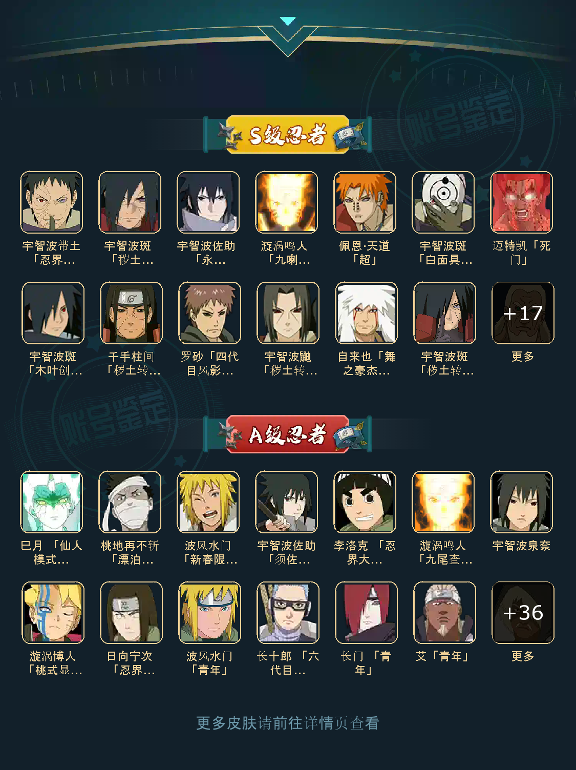 VIP13级;S忍26个;A忍41个,通灵兽22个,S忍:普通纲手大蛇丸波风水门猿飞日斩永恒万花筒佐助仙人自来也百豪纲手死门凯豪杰自来也千手扉间秽土扉间千手柱间秽土柱间秽土斑木叶创立斑秽土解斑须佐鼬秽土鼬白面具忍战带土罗...