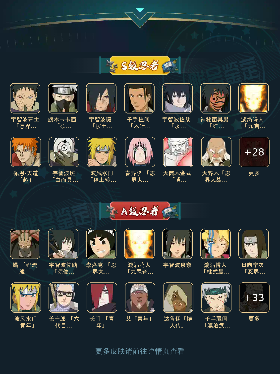 VIP11级;S忍41个;A忍42个,通灵兽20个,S忍:猿飞日斩大蛇丸普通纲手九喇嘛鸣人永恒万花筒佐助忍战樱仙人自来也百豪纲手普通自来也豪杰自来也死门凯波风水门秽土水门秽土猿飞千手扉间秽土扉间千手柱间秽土柱间木叶创立柱...