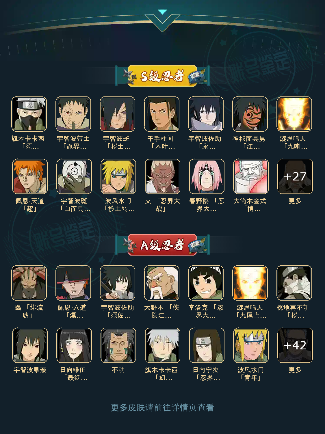 S忍40个;A忍48个,通灵兽19个,S忍:普通自来也大蛇丸普通纲手九喇嘛鸣人永恒万花筒佐助忍战樱百豪纲手死门凯波风水门豪杰自来也秽土水门猿飞日斩秽土猿飞千手扉间秽土扉间秽土柱间木叶创立柱间秽土斑宇智波斑木