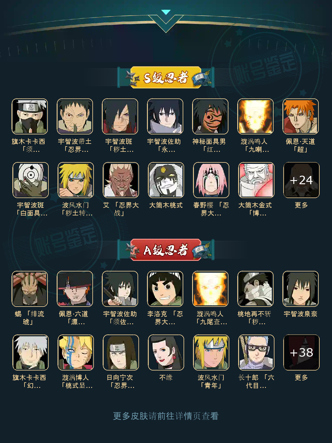 VIP11级;S忍33个;A忍43个,通灵兽23个,S忍:猿飞日斩九喇嘛鸣人永恒万花筒佐助忍战樱普通自来也大蛇丸普通纲手百豪纲手死门凯豪杰自来也波风水门秽土水门秽土扉间千手扉间千手柱间秽土柱间秽土斑宇智波斑木叶创立斑秽土