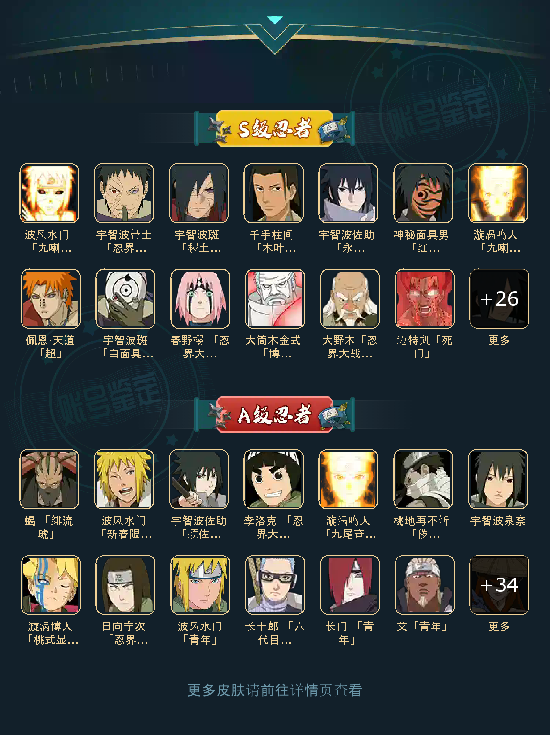 战力:1510W+;S忍37个;A忍39个,通灵兽21个,S忍:普通纲手大蛇丸波风水门猿飞日斩九喇嘛鸣人永恒万花筒佐助忍战樱仙人自来也普通自来也豪杰自来也百豪纲手死门凯秽土猿飞秽土扉间千手扉间千手柱间秽土柱间木叶创立柱间秽土斑木叶创立斑秽土
