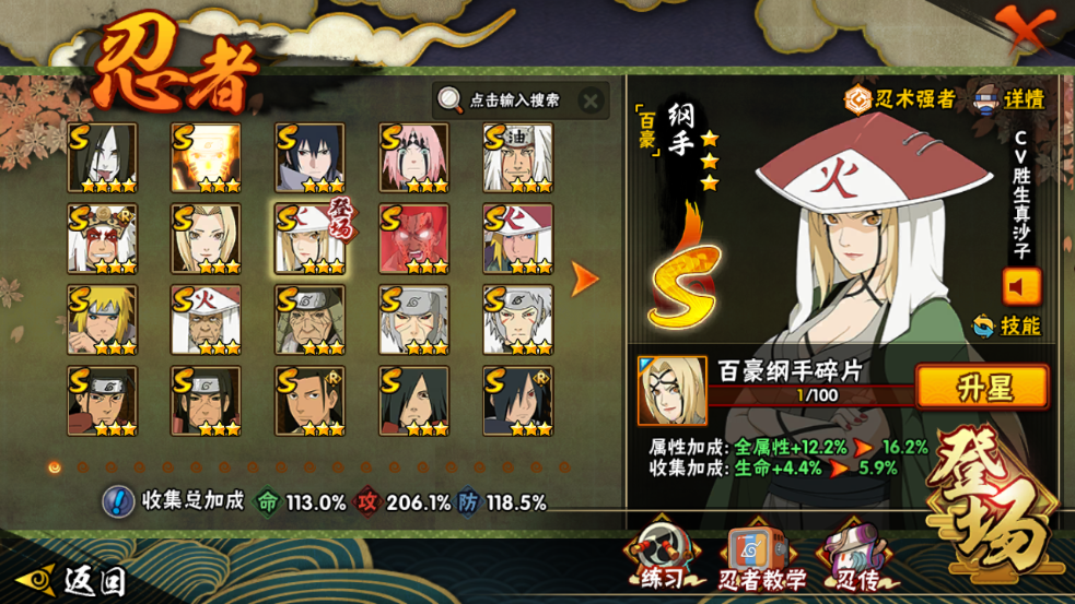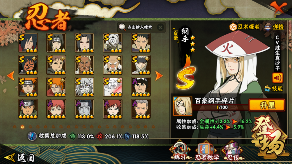 战力:1383W+;S忍34个;A忍45个,通灵兽19个,S忍:大蛇丸九喇嘛鸣人永恒万花筒佐助忍战樱普通自来也百豪纲手普通纲手死门凯波风水门豪杰自来也秽土水门猿飞日斩秽土猿飞秽土扉间千手扉间千手柱间秽土柱间木叶创立柱间宇智波斑木叶创立斑秽土