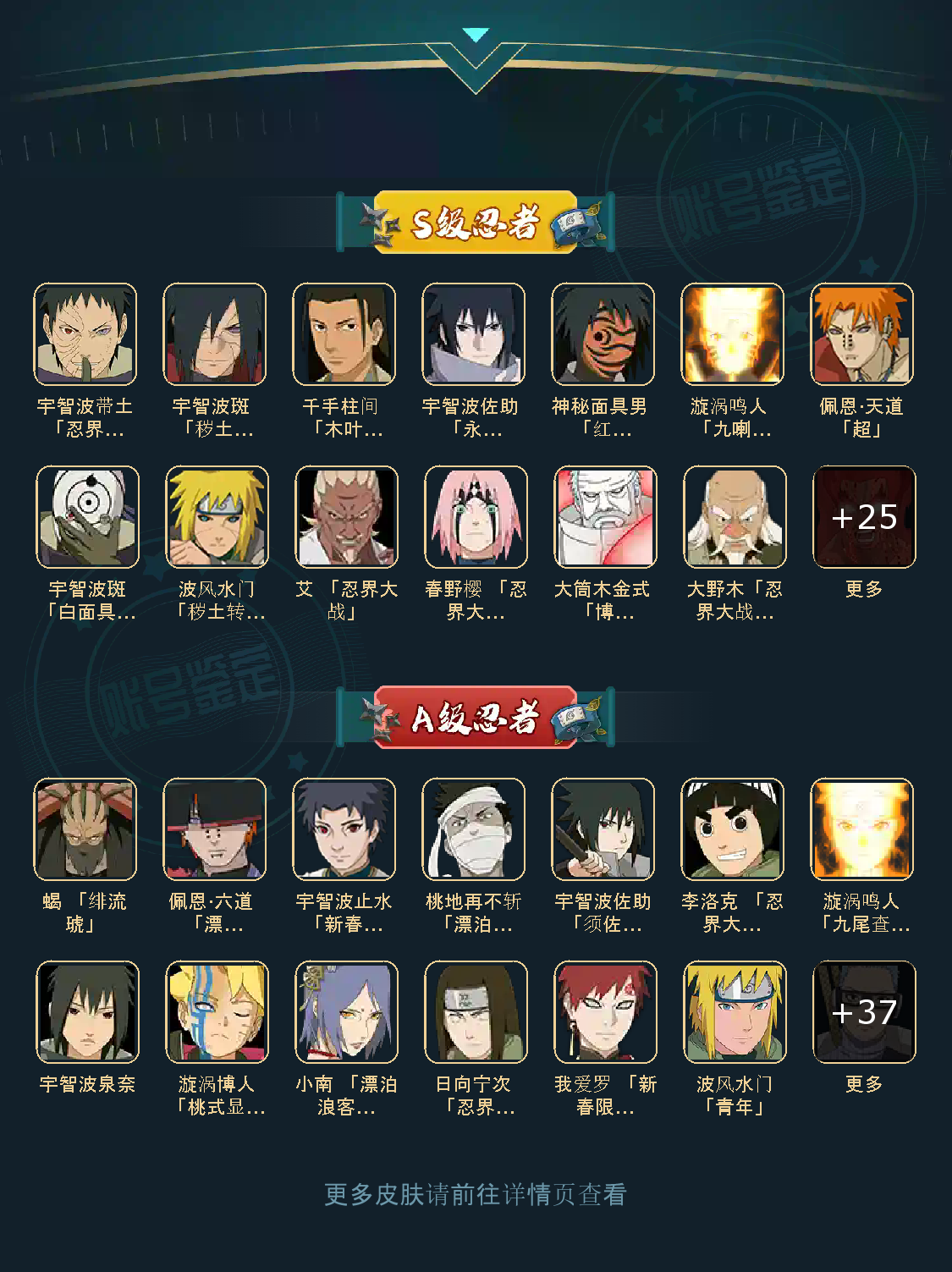 战力:1323W+;S忍34个;A忍43个,通灵兽18个,S忍:大蛇丸猿飞日斩九喇嘛鸣人永恒万花筒佐助忍战樱仙人自来也百豪纲手普通纲手普通自来也豪杰自来也死门凯波风水门秽土水门秽土扉间千手扉间木叶创立柱间秽土柱间秽土斑木叶创立斑秽土解斑秽土