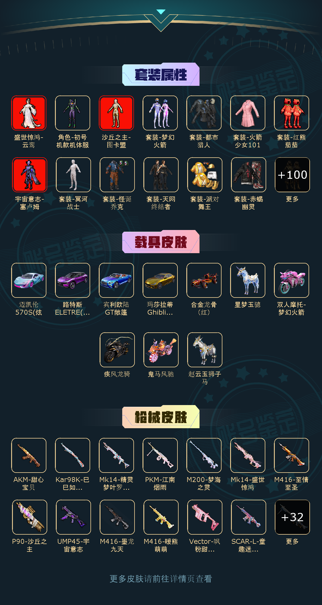 103粉,10载具,378套装,DP-28-暗夜鎏金/M417-第五大道/UZI-绮梦青鸾/AKM-甜心宝贝/Vector-飒粉甜心/SCAR-L-童趣迷兔/AUG-星之彼岸/M249-彩虹甜喵/平底锅-仲夏莫吉托/AWM-花间之火/M762-甜心娃娃/汤姆逊-怪笑疯兔/P90-甜蜜草莓/GROZA-香水柠檬/Mk14-精灵梦叶罗丽/M416-暖熊萌萌/SPAS-12-音爆索尼克/P90-金丰海韵/UMP45-宇宙意志/M416-心之恋语/SCAR-L-纯梦嫁纱/Mk14-闲梦青缨/M16A4-垂柳戏鸭/Kar98K-未来歌姬/MG3-洛神天依/Vector-环太平洋/M416-墨龙九天/M200-梦海之灵/M416-至情至圣/PKM-江南烟雨/AUG-妙趣可丽/UMP45-雪国精灵/烟雾弹-猫咪绅士/野牛-青空秋雨/UMP45-恐龙拽拽/M249-蓝莓炮弹/P90-沙丘之主/蜜獾-辉耀战甲/破片手榴弹-粉粉猫爪/AKM-梦之光华/M24-莲影清波/迈凯伦570S(炫冰蓝)/玛莎拉蒂Ghibli(金)/疾风龙骑/双人摩托-梦幻火箭/星梦玉骢/宾利欧陆GT敞篷(深空蓝)/路特斯ELETRE(电光紫)/赵云玉狮子马/鬼马风驰/合金龙骨(红)/