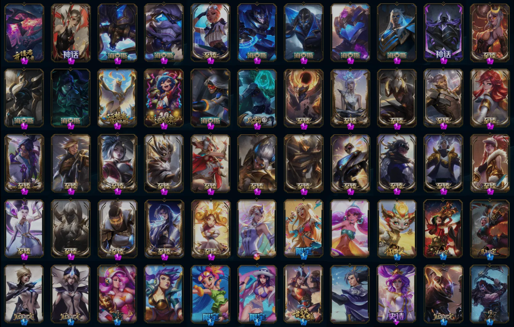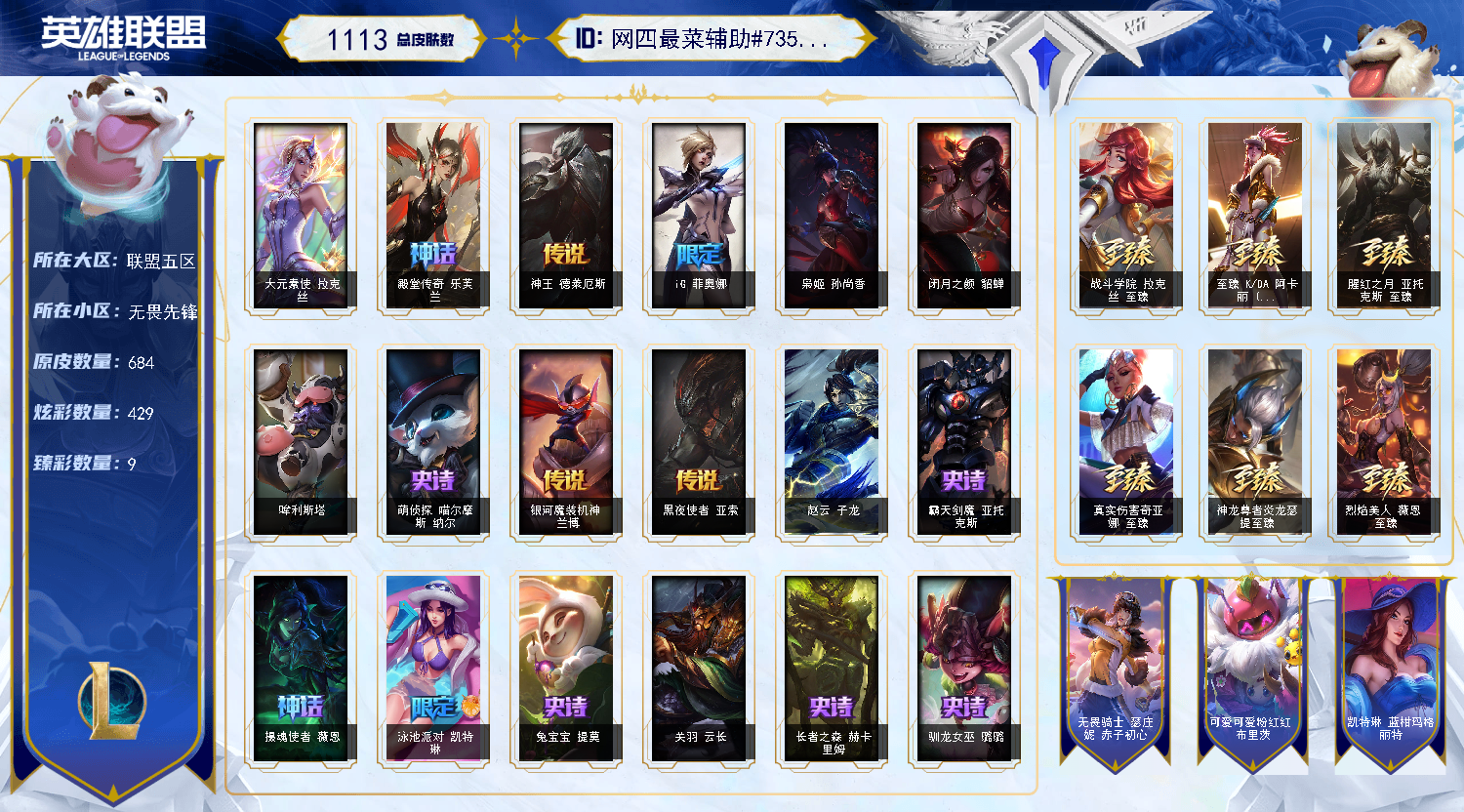 【重要皮肤】心之钢永恩至臻 魔女阿卡丽至臻 灵魂莲华易至臻 海珀利安小队X09星环灵风迦娜至臻 神凰行者烈羽焰凰霞至臻 魔女婕拉至臻 未来战士卢锡安至臻 真实伤害亚索至臻 真实伤害赛娜至臻 灵能特工伊泽瑞尔至臻 源计划逆流塞拉斯至臻 王国机神玄武盖伦至臻 暗星墨菲特至臻 神龙尊者炎龙瑟提至臻 KDA二代卡莎至臻 KDA阿卡丽至臻 KDA阿卡丽2022至臻 战斗学院拉克丝至臻 战斗学院拉克丝2022至臻 烈焰美人薇恩至臻 烈焰美人薇恩2022至臻 星之守护者妮蔻至臻 星之守护者妮蔻2022至臻 真实伤害奇亚娜至臻 真实伤害奇亚娜2022至臻 腥红之月亚托克斯至臻 腥红之月亚托克斯2022至臻 未来战士锤石至臻 未来战士锤石2022至臻 黑夜使者李青至臻 黑夜使者李青2022至臻 殿堂传奇乐芙兰 灰烬骑士莫德凯撒 海克斯科技安妮 海克斯科技斯维因 海克斯科技吉格斯 海克斯科技嘉文四世 海克斯科技阿利斯塔 海克斯科技拉莫斯 暗星科加斯 零之枪骑赫卡里姆 摄魂使者薇恩 新创战纪希维尔 胜利女神娑娜 胜利之王泰达米尔 胜利巨口克格莫 养蜂人辛吉德 勇敢的心德莱厄斯 电玩女神厄运小姐 电玩女神阿狸 玉剑传说舞龙卫 天龙之子斯莫德 替父从军花木兰 神龙烈焰金克丝 你看见过我的熊猫吗安妮 紫金罗刹莫甘娜 醒狮克格莫 胜利女神瑟庄妮 胜利机器人布里茨 胜利女神奥莉安娜 胜利枪神格雷福斯 胜利枪神卢锡安 胜利之剑亚托克斯 觅心女王艾希 圣诞老人德莱文 冰雪风暴希维尔 冬季仙境卡尔玛 魄罗骑士瑟庄妮 夺命美人卡特琳娜 圣诞糖果棒厄运小姐 勇敢的心德莱厄斯 海之歌萨勒芬妮 泳池派对凯特琳 泳池派对佐伊 泳池派对普朗克 泳池派对厄运小姐 泳池派对塔里克 泳池派对李青 送披萨的小姐姐希维尔 鸡里奥 克格汪 FPX李青 iG乐芙兰 iG菲奥娜 SKTT1辛德拉 SKTT1奥拉夫 SKTT1瑞兹 SKTT1阿兹尔 SSW雷恩加尔 SSW泰隆 SKTT1劫 SKTT1婕拉 SKTT1李青 暗杀星蒙多 暗杀星努努和威朗普 暗杀星伊泽瑞尔 暗杀星慎 Fnatic卡尔萨斯 冰雪节玛尔扎哈 冰雪节辛吉德 防暴士兵辛吉德 防暴天使凯尔 冠军典狱长锤石 冠军之刃锐雯2016 鬼影森森茂凯 鬼影重重魔腾 胡桃夹子萨科 惊悚派对阿木木 密林猎手提莫 南瓜头费德提克 女猎手希维尔 圣诞精灵崔丝塔娜 圣诞开心鬼提莫 圣诞狂欢基兰 圣诞狂欢努努和威朗普 圣诞老人古拉加斯 喜庆之树茂凯 邪恶圣诞老人维迦 雪默丁格 野兽猎人德莱文 野兽猎人瑟庄妮 永恒之森乐芙兰 征服者卡尔玛 暗影沃里克 阿木木主人不要我了 地底世界崔斯特 都铎王朝图奇 十五周年纪念希维尔 十周年纪念安妮 源代码乐芙兰 神凰行者瑞羽圣凰艾尼维亚 胜利凤凰艾尼维亚 大元素使拉克丝 绝息圣堂洛