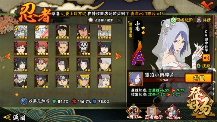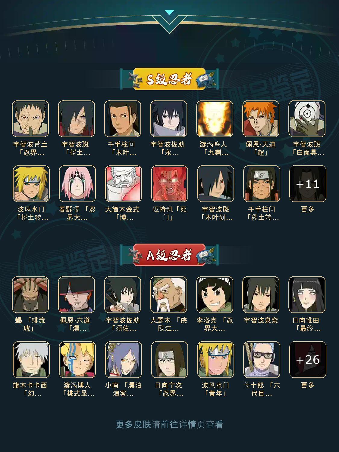 战力:1273W+;VIP11级;S忍22个;A忍33个,通灵兽18个,S忍:九喇嘛鸣人永恒万花筒佐助忍战樱豪杰自来也大蛇丸普通纲手死门凯波风水门秽土水门猿飞日斩秽土柱间木叶创立柱间秽土斑木叶创立斑秽土解斑秽土鼬神秘面具男白面具忍战带土天道