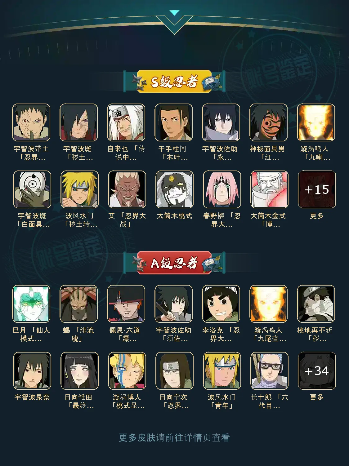 战力:1300W+;VIP11级;S忍27个;A忍37个,通灵兽19个,S忍:九喇嘛鸣人永恒万花筒佐助忍战樱豪杰自来也大蛇丸百豪纲手普通纲手死门凯波风水门秽土水门猿飞日斩秽土猿飞秽土扉间木叶创立柱间秽土解斑白面具忍战带土红夜面具男金角银角秽