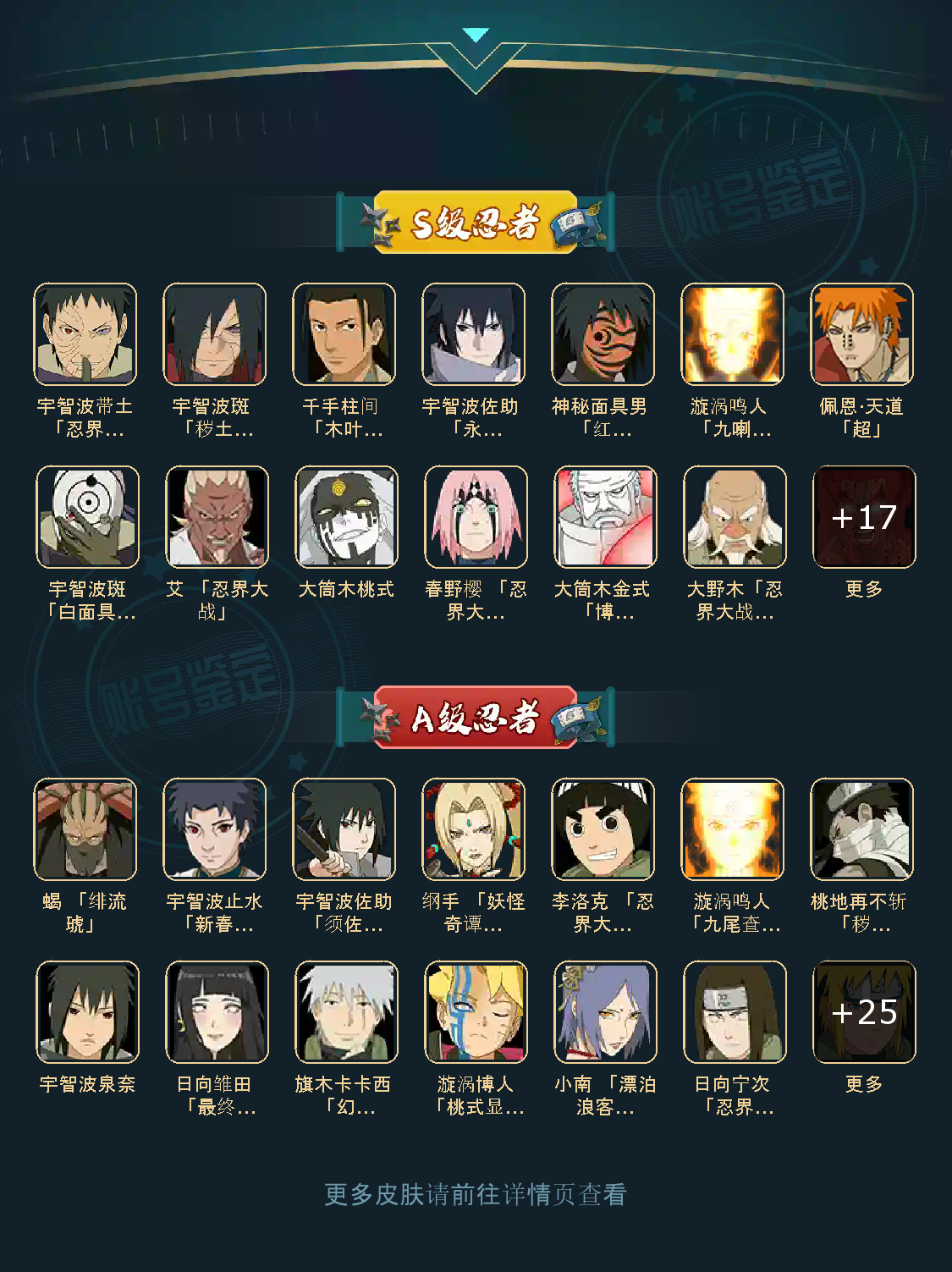 战力:1353W+;VIP11级;S忍30个;A忍30个,通灵兽18个,S忍:普通纲手猿飞日斩九喇嘛鸣人永恒万花筒佐助忍战樱仙人自来也大蛇丸死门凯普通自来也豪杰自来也波风水门秽土猿飞秽土扉间木叶创立柱间秽土柱间木叶创立斑秽土解斑须佐鼬秽土鼬