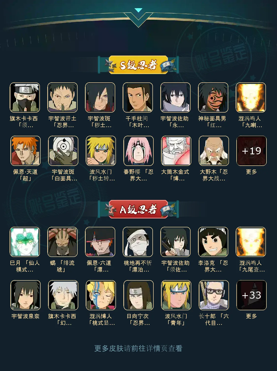 战力:1097W+;VIP11级S忍28个A忍38个木叶创立柱间忍战樱永恒万花筒佐助白面具仙人兜秽土扉间秽土斑秽土水门豪杰自来也秽土鼬天道超宇智波斑秽土解斑波风水门普通纲手普通自来也大蛇丸猿飞日斩罗砂秽土柱间三代艾忍战带土木叶创立斑死门凯忍