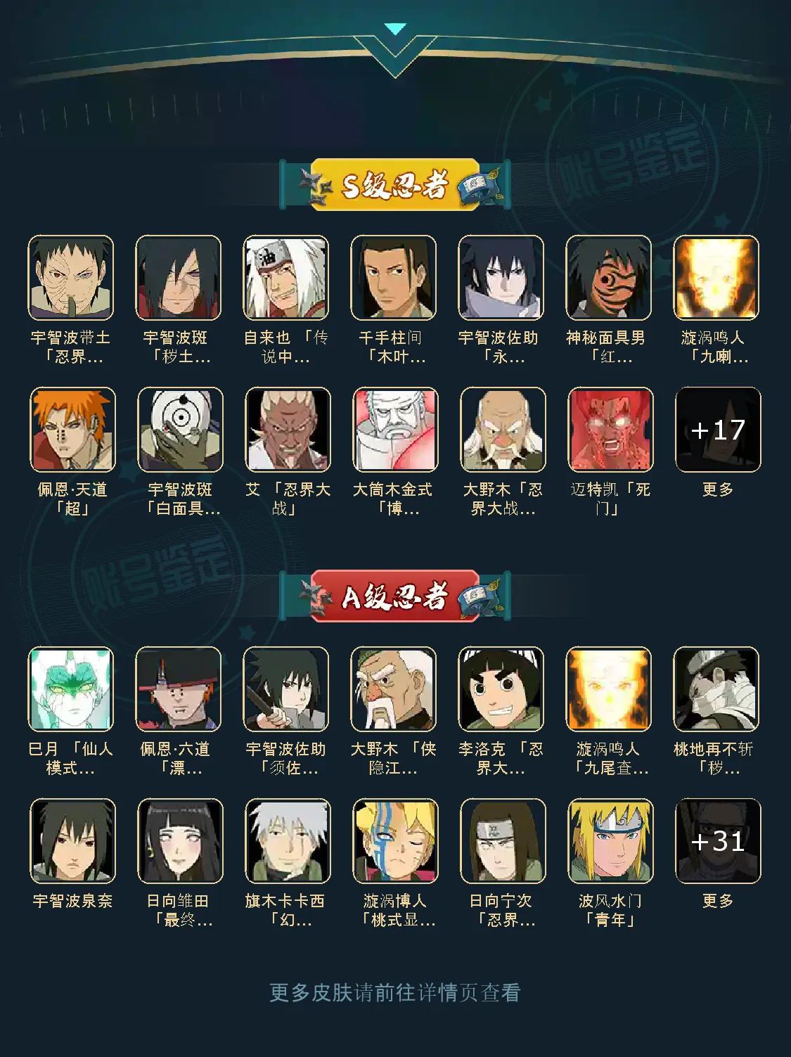 战力:926W+;VIP11级;S忍26个;A忍35个,通灵兽20个,S忍:九喇嘛鸣人永恒万花筒佐助普通自来也豪杰自来也大蛇丸普通纲手死门凯波风水门秽土猿飞秽土扉间秽土柱间木叶创立柱间秽土斑木叶创立斑秽土解斑秽土鼬白面具忍战带土红夜面具男罗