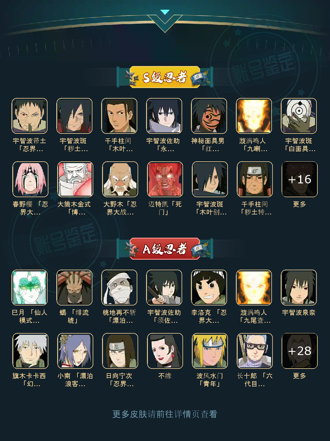 战力:1313W+;S忍27个;A忍35个,通灵兽18个,S忍:大蛇丸九喇嘛鸣人永恒万花筒佐助忍战樱普通自来也普通纲手死门凯波风水门猿飞日斩豪杰自来也秽土猿飞秽土扉间木叶创立柱间秽土柱间秽土斑木叶创立斑须佐鼬秽土鼬白面具忍战带土红夜面具男罗