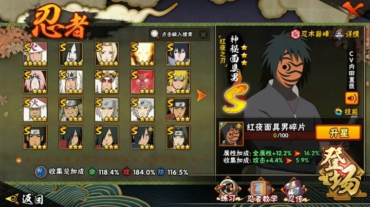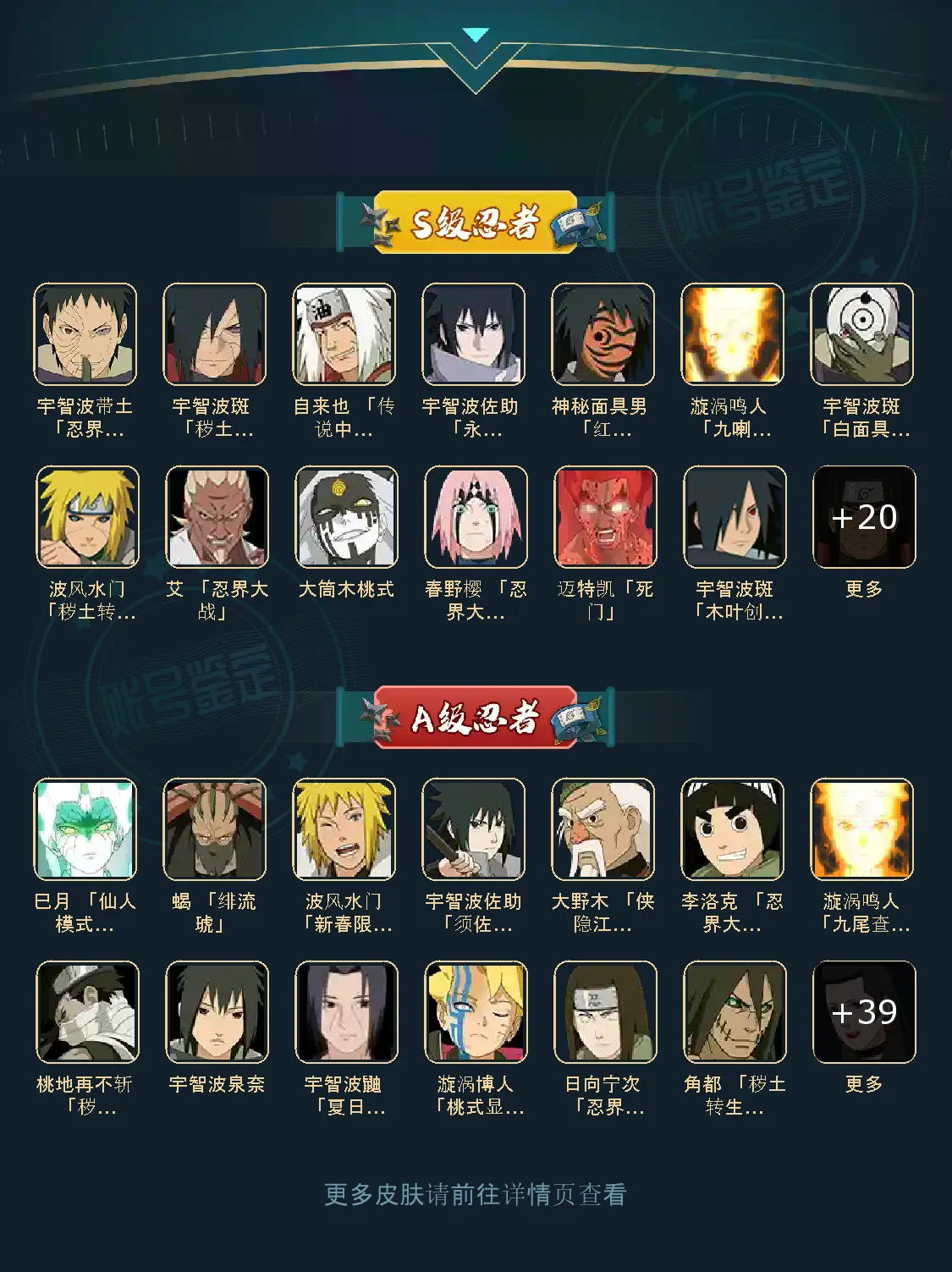 ;VIP11级;S忍30个;A忍40个,通灵兽22个,S忍:波风水门大蛇丸普通纲手九喇嘛鸣人永恒万花筒佐助忍战樱死门凯秽土水门普通自来也豪杰自来也猿飞日斩秽土猿飞千手扉间秽土扉间千手柱间秽土柱间秽土斑宇智波斑木叶创立斑须佐