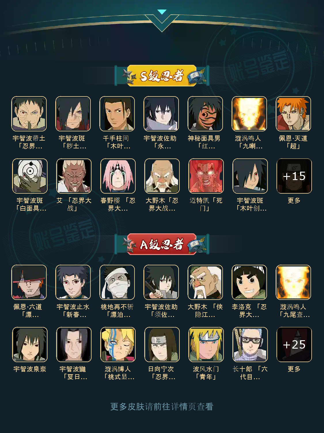 战力:730W+;VIP12级;S忍24个;A忍33个,通灵兽18个,S忍:九喇嘛鸣人永恒万花筒佐助忍战樱普通自来也豪杰自来也大蛇丸死门凯波风水门秽土猿飞千手扉间秽土柱间木叶创立柱间木叶创立斑秽土解斑秽土鼬白面具忍战带土红夜面具男罗砂鬼灯幻