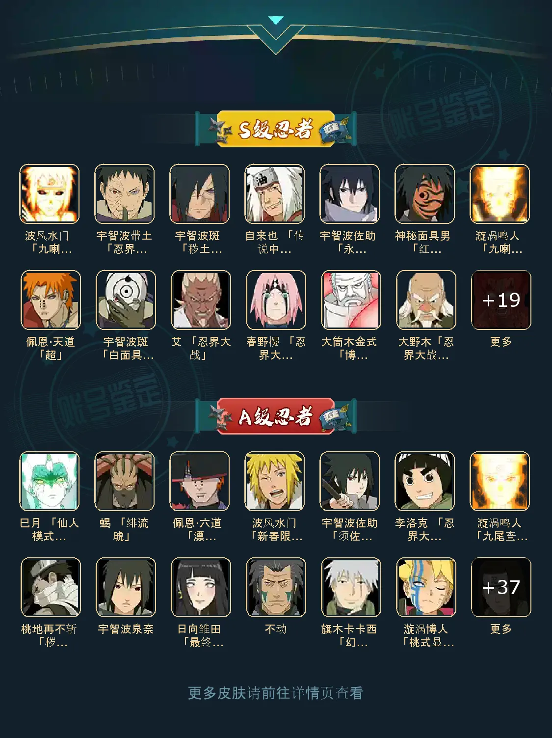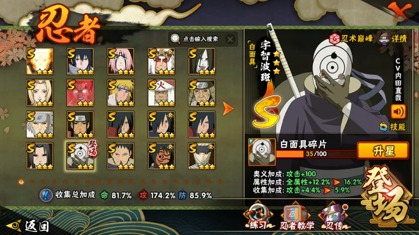 战力:1106W+;VIP12级;S忍26个;A忍40个,通灵兽21个,S忍:九喇嘛鸣人永恒万花筒佐助忍战樱豪杰自来也大蛇丸普通纲手死门凯波风水门秽土猿飞猿飞日斩秽土扉间秽土柱间秽土斑木叶创立斑秽土解斑秽土鼬白面具忍战带土红夜面具男忍战大野