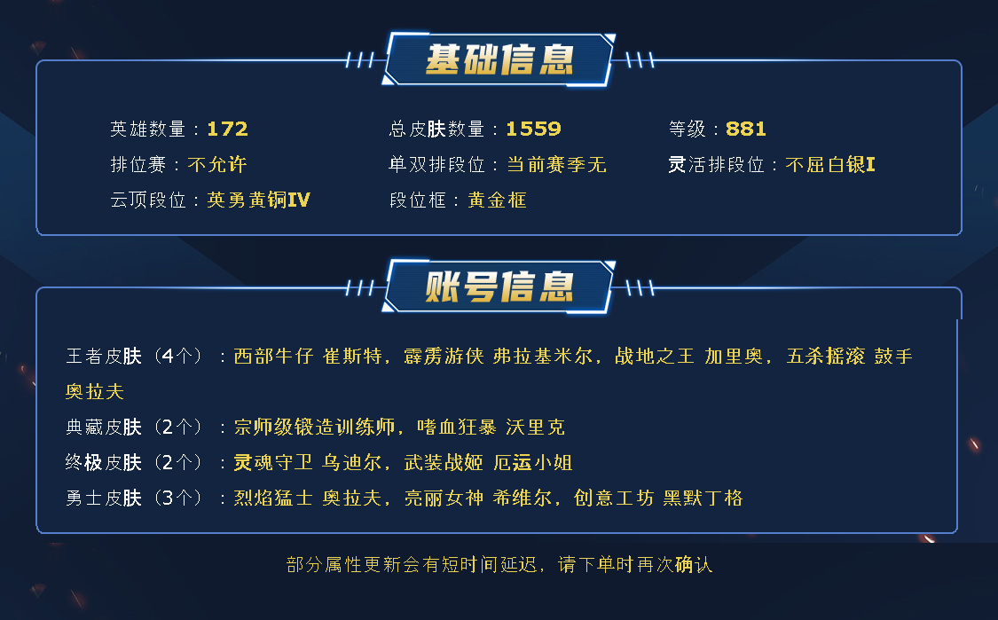 全英雄,不要动我战利品,我会随时更新P,所以不要动,谢谢。667P全是高质量,谁玩谁知道,租了不吃亏租了不上当,Wegame可能会被顶,不用管,我可能会玩cf账号,cf登陆完成之后就好了,可以稍微等一会或者直接顶我,我知道的。都会有新皮肤进账,老板可以收藏起来,下次玩还可以租,就是战利品不要动,我有时会自己上线弄新皮肤老板一定不要动我战利品,谢谢。基本每个英雄都有一个,质量还是非常高的,一些常用的英雄我都有皮肤,质量也是比较高的,用了不吃亏用了不上当,绝对值这个价。老板们玩的话可以收藏起来,避免下次找不到了。多多支持。如果登录有问题多登几遍,如还是不行就是当时网络波动有问题,老板还是重新租别的号吧,但是可以把我的收藏起来,下次还可以租的哦。感谢老板们支持,祝老板们玩的开心。