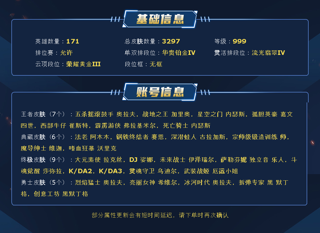 ~~喜欢记得收藏~~可排位~~3000皮全英雄丨1466原皮1509炫彩丨100神话/至臻/海克斯丨IG套丨灵魂莲华套丨神龙尊者套丨剪纸套丨鼠年套丨幻灵套丨虎年套丨执事套丨电玩套丨女帝套丨EDG套丨FPX套丨DRX套丨KDA套丨墨之影套丨至高天套丨青花瓷套丨海之歌套丨斗魂觉醒套丨太空律动套丨净雪之月套丨破败军团套丨光明哨兵套丨咖啡甜心套丨水晶玫瑰套丨幽梦玫瑰套丨福牛守护者套丨星之守护者套丨龙瞎/龙的传人丨冰原女警丨甜心霞洛丨玉剑男女刀丨泳池女警佐伊丨觅心悠米金克斯丨斩星穿星创星御星~~租之前尽量查一下游戏ID,确保段位是您需要的,避免浪费您的时间~~请勿挂机逃跑故意送人头,谢谢合作,谢谢~~